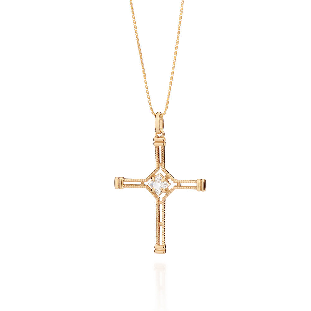 This 18K gold-plated openwork cross pendant measuring 4.7cm x 3.1cm (1.85in x 1.22in) is accented with a carré-cut zirconia measuring 5.00mm, symbolizing clarity and faith within Rommanel’s history.