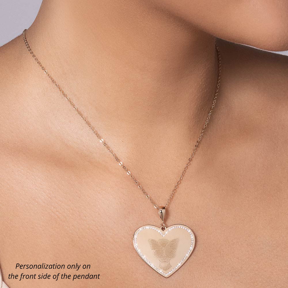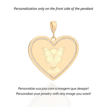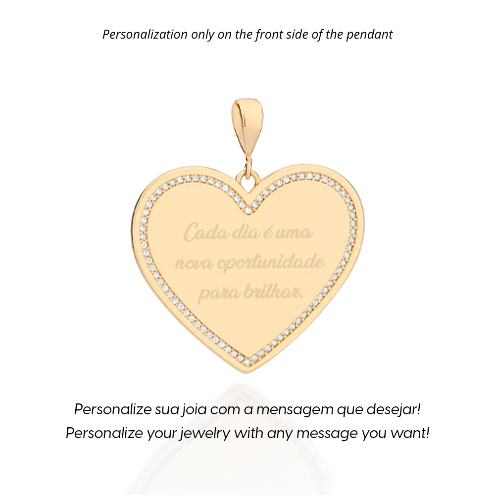 18k gold-plated customizable pendant in the shape of a heart studded by eighty (80) zirconias measuring 1mm each. size: 4cm x 3.1cm (1.57in x 1.22in).