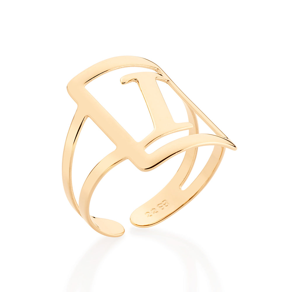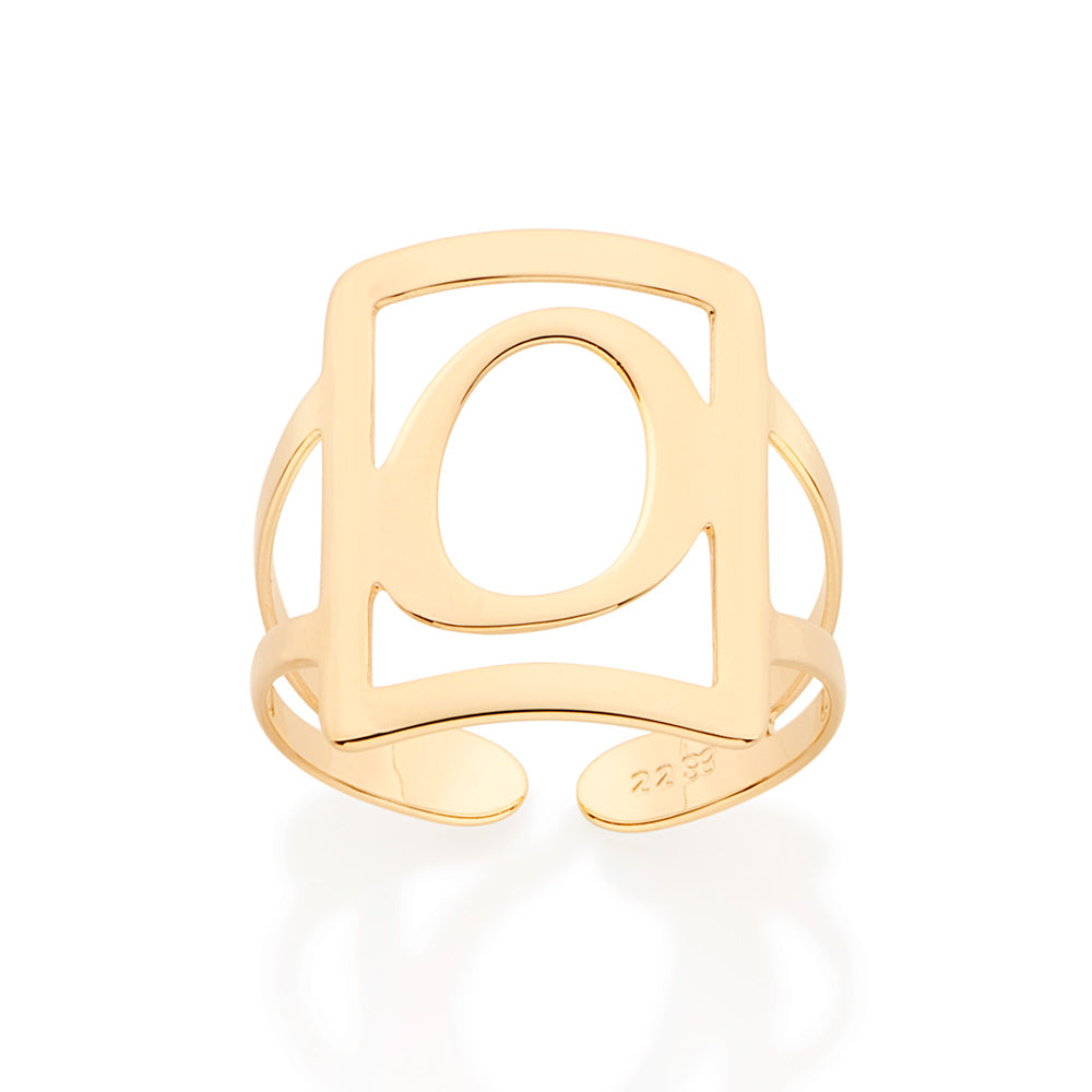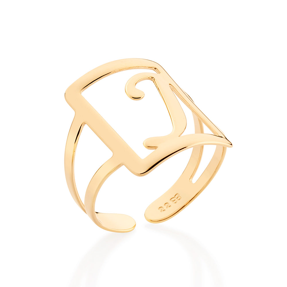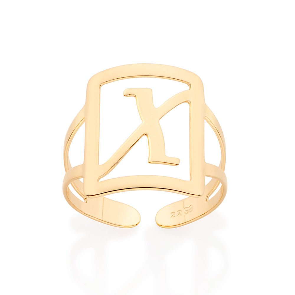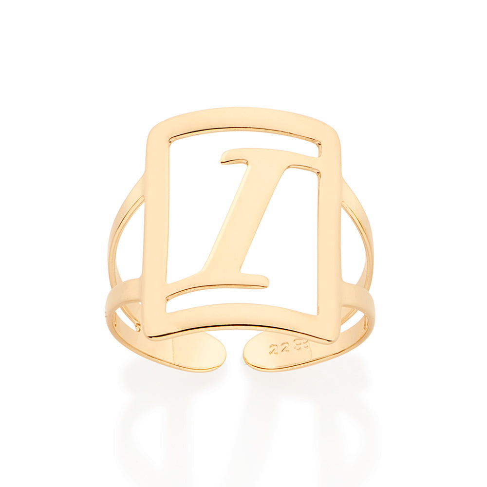 Gold plated adjustable maxi ring in a rectangular shape with engraved initial at the center.