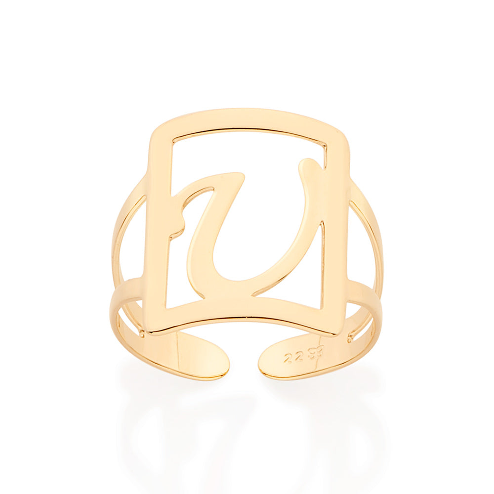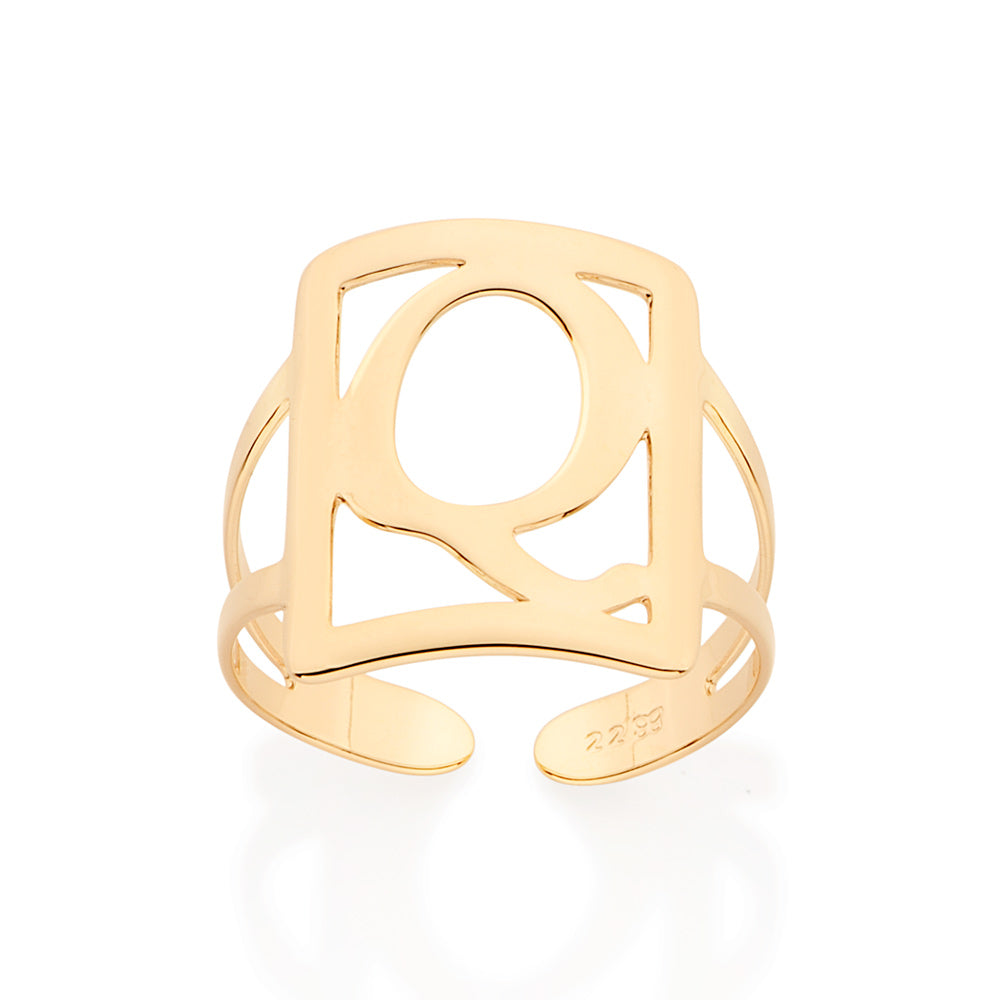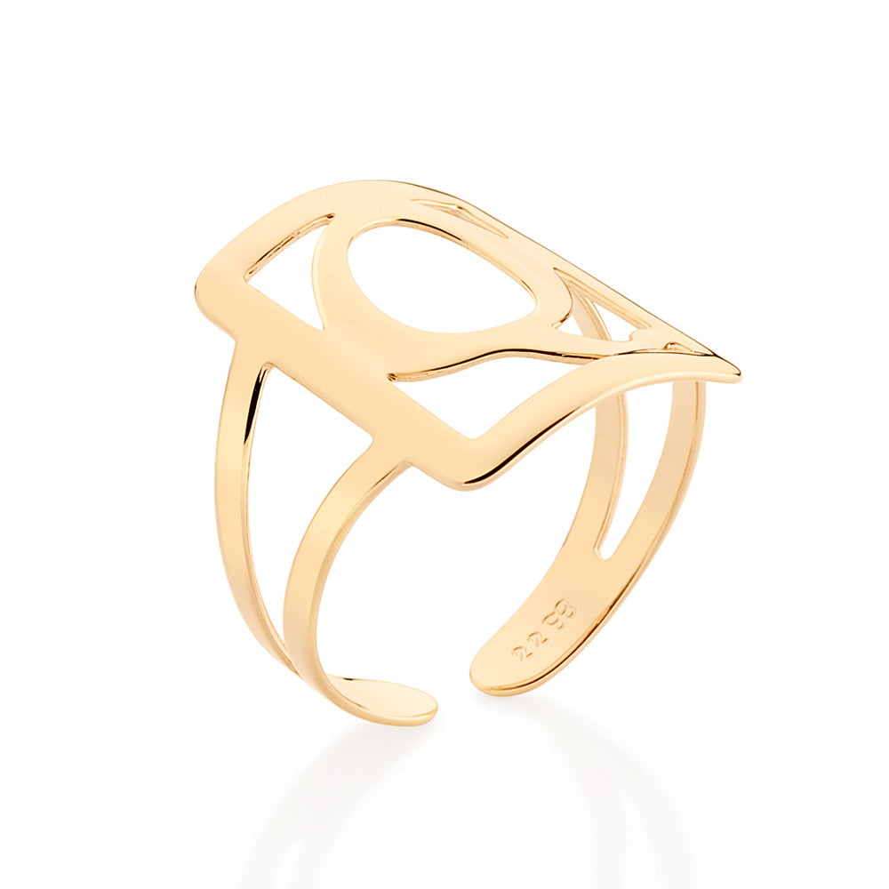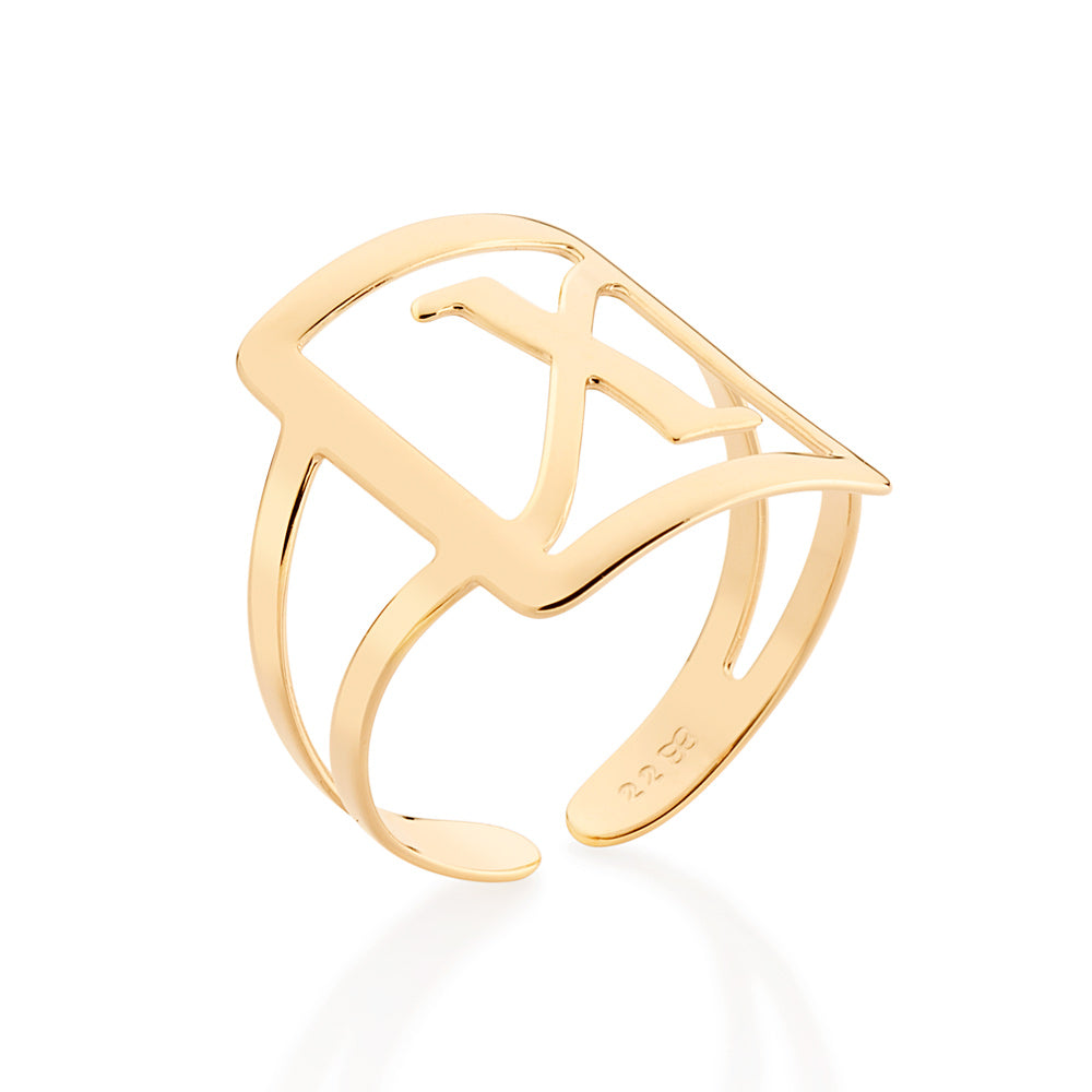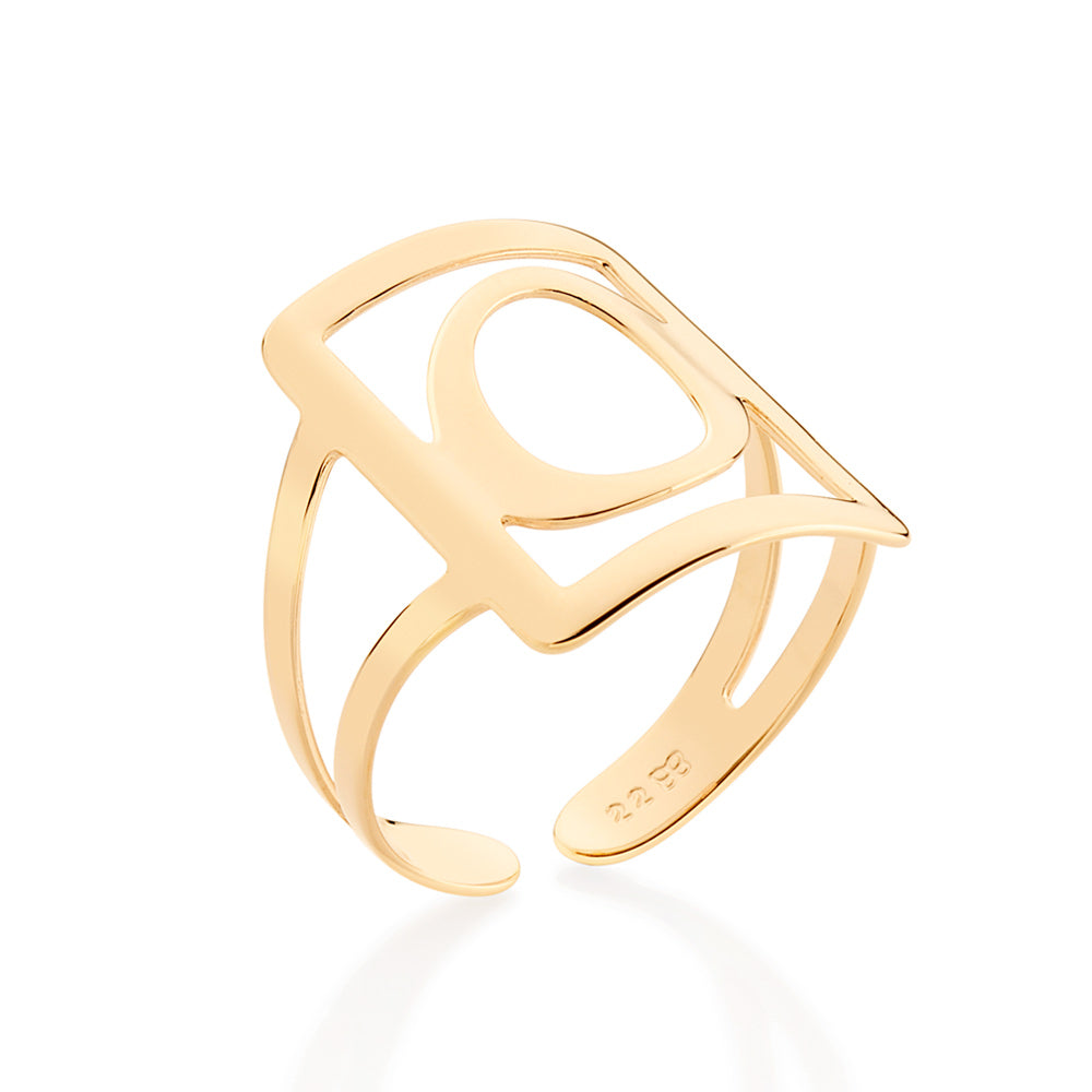 Gold plated adjustable maxi ring in a rectangular shape with engraved initial at the center.