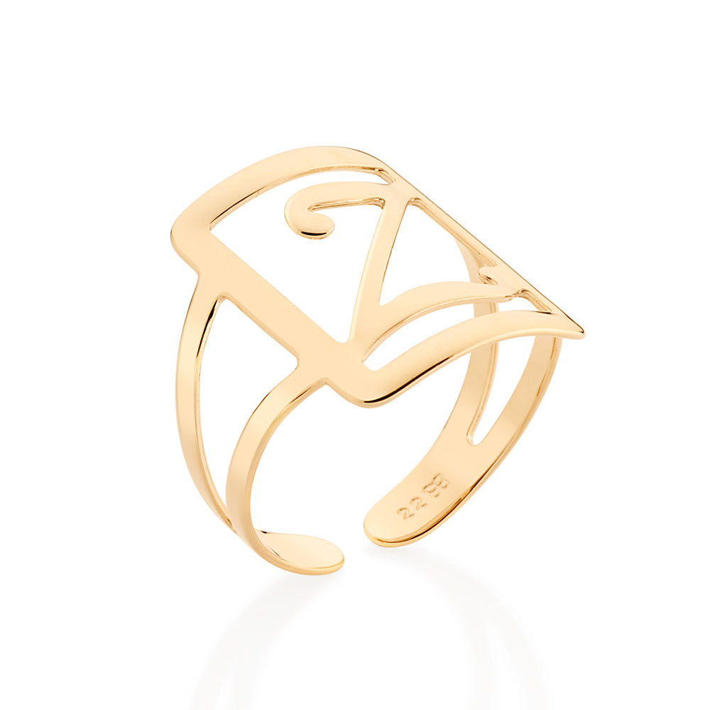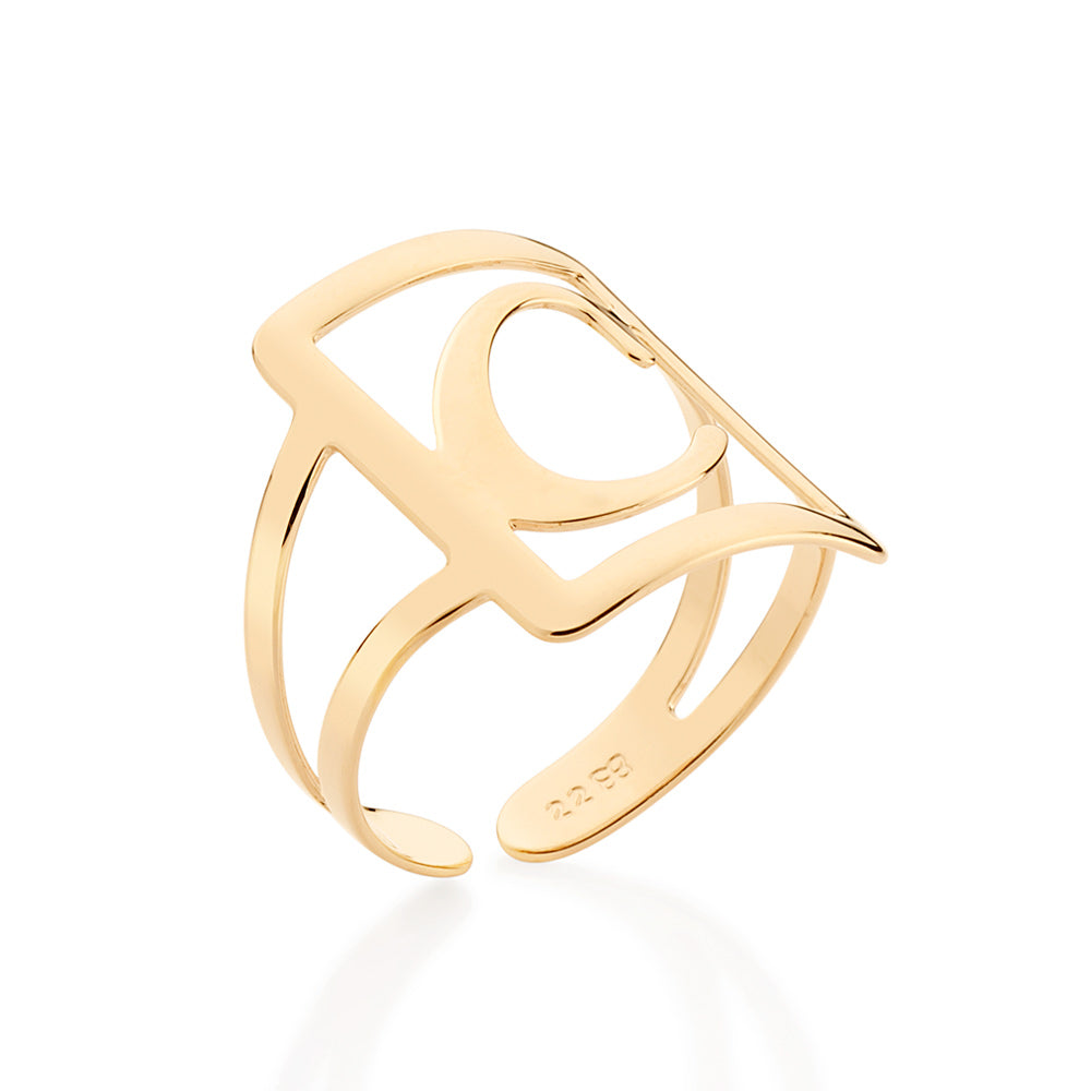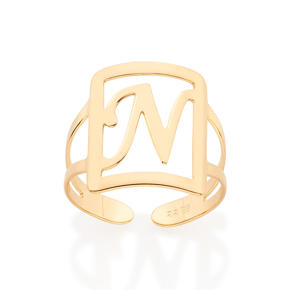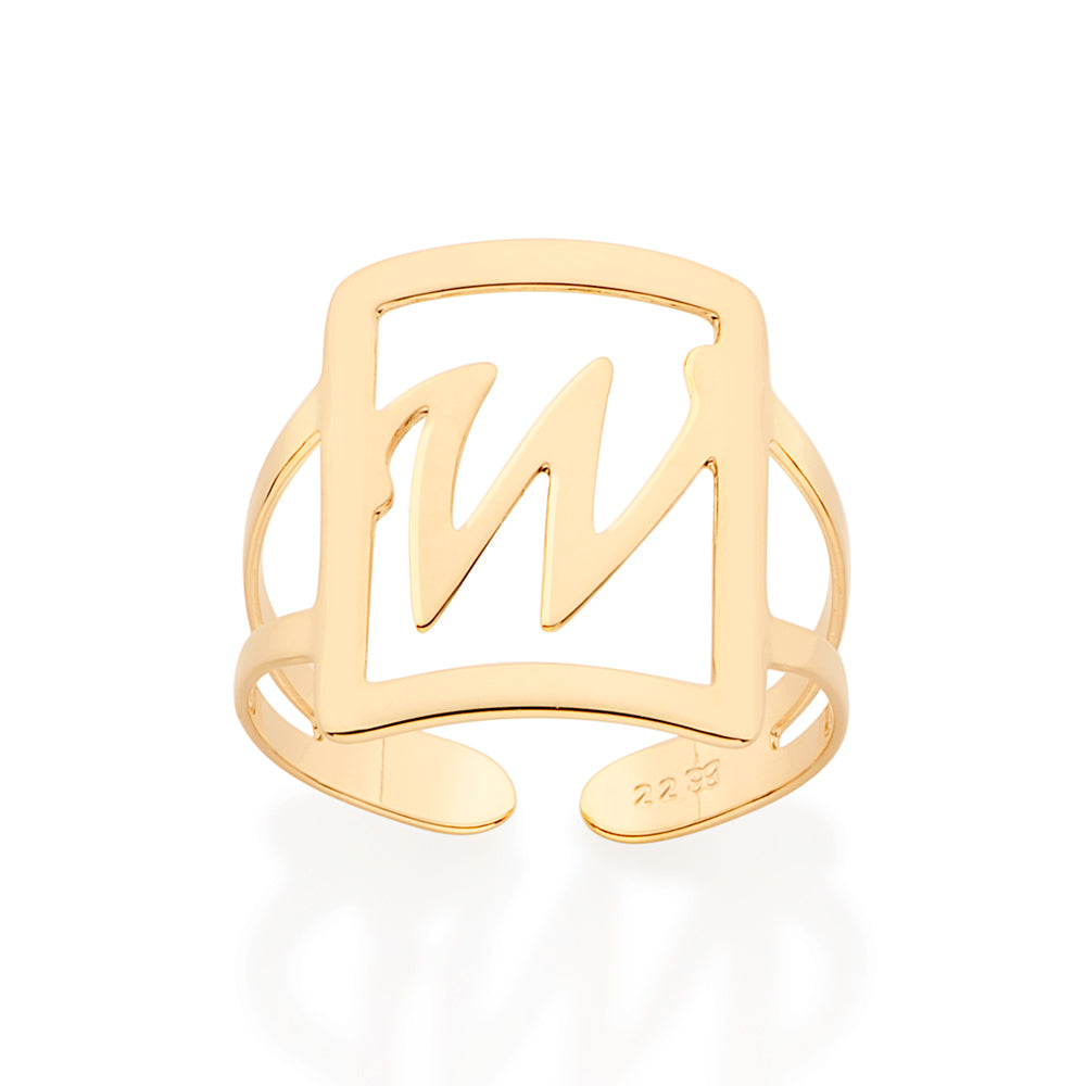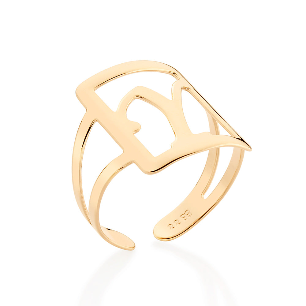 Gold plated adjustable maxi ring in a rectangular shape with engraved initial at the center.