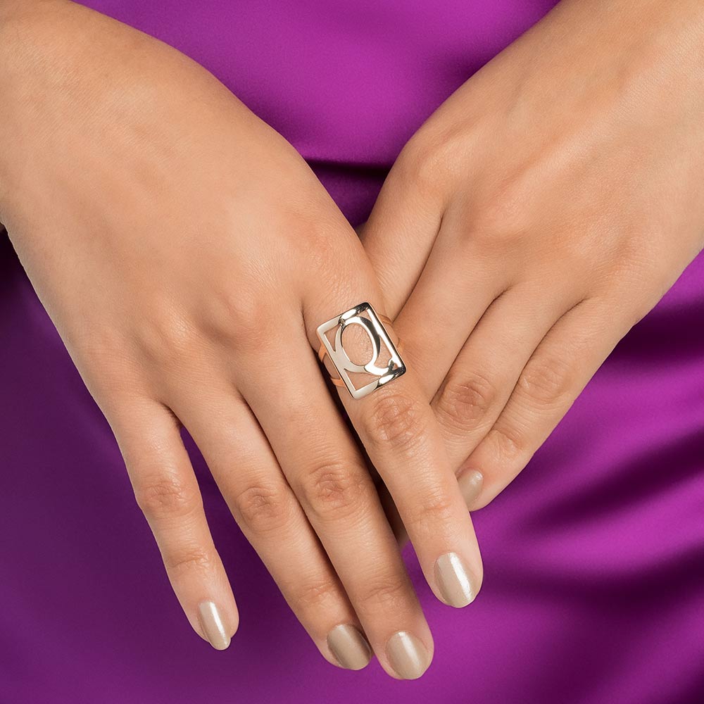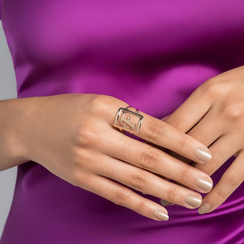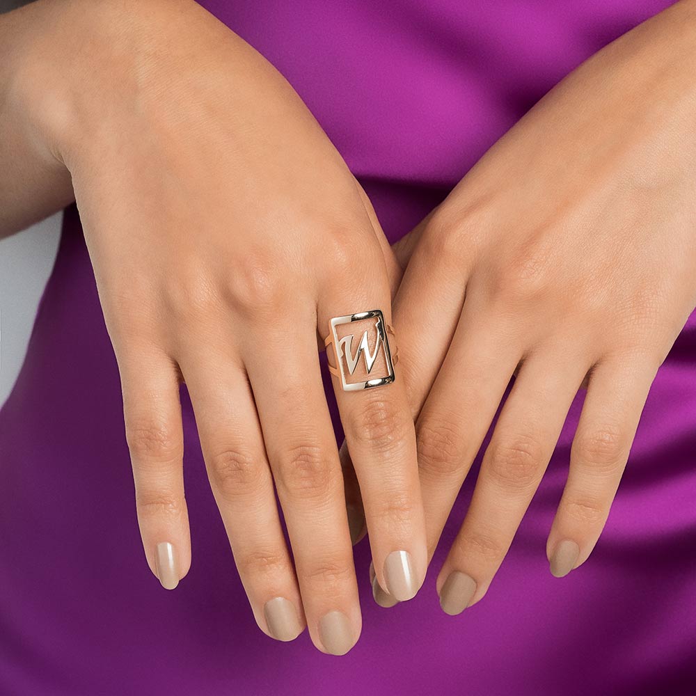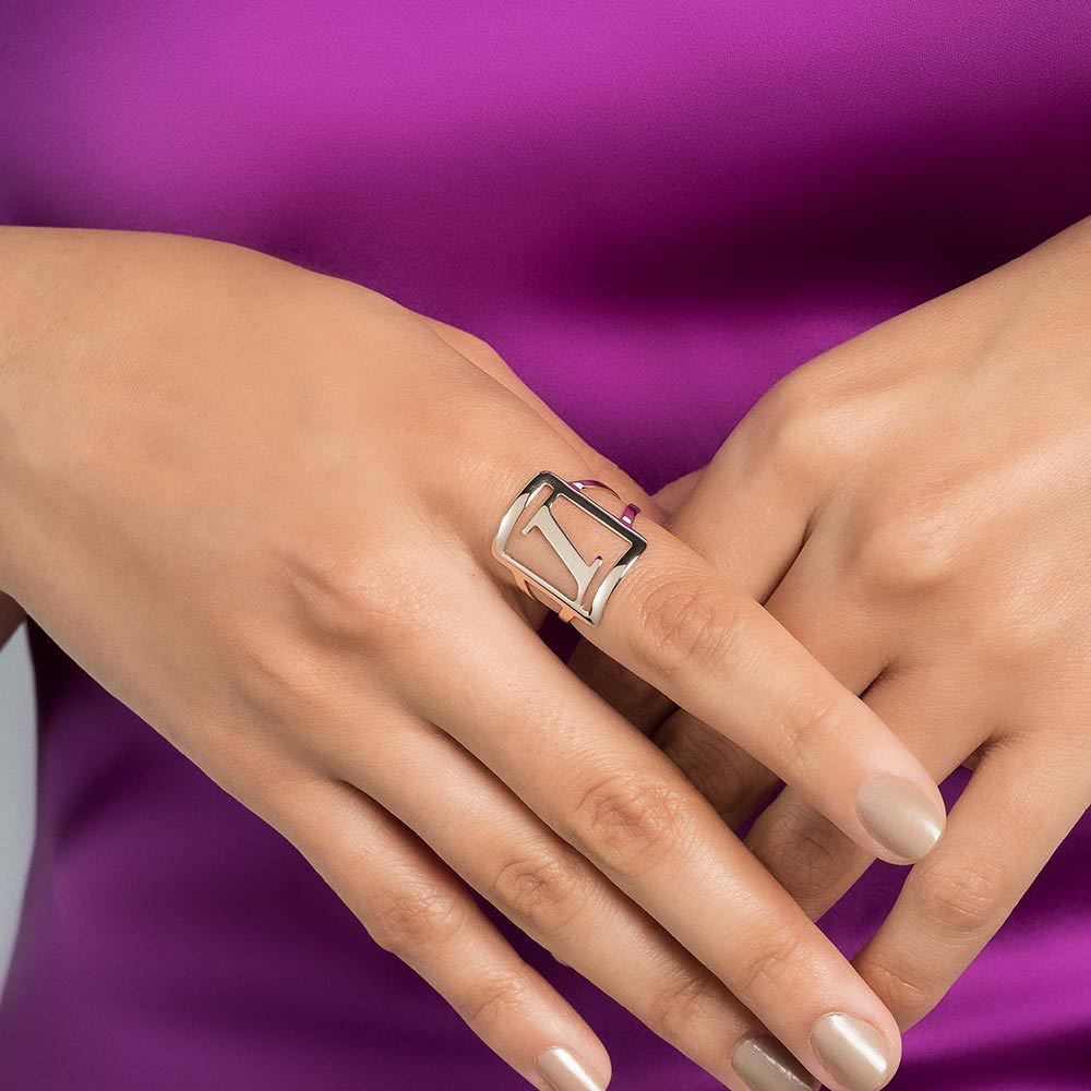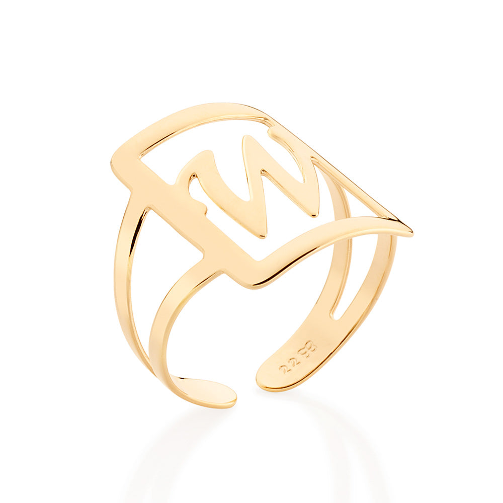 Gold plated adjustable maxi ring in a rectangular shape with engraved initial at the center.