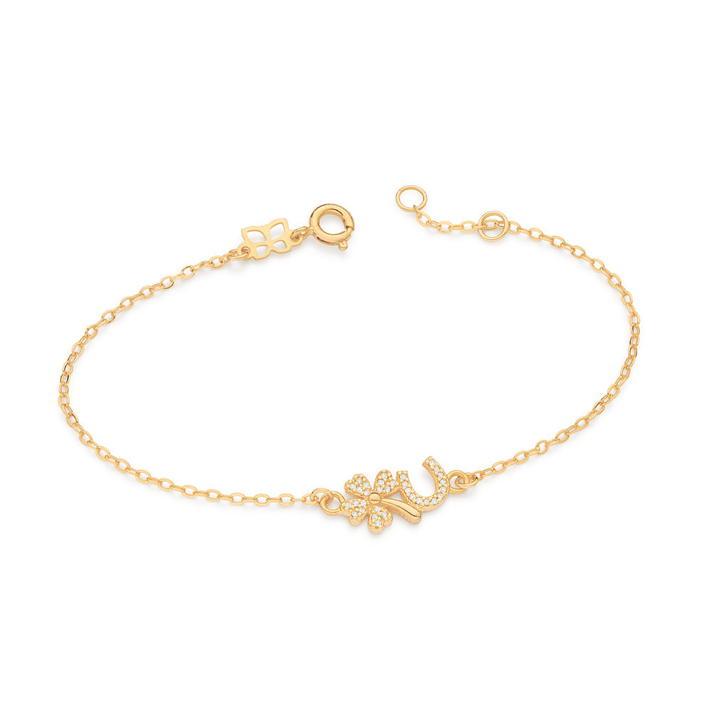 ROOTED IN SYMBOLS OF PROTECTION AND PROSPERITY, THIS 18K GOLD-PLATED CHAIN BRACELET MEASURING 18CM (7.25IN), ADJUSTABLE TO 17CM (7IN), FEATURES A FOUR-LEAF CLOVER AND HORSESHOE CHARM ADORNED WITH THIRTY-TWO (32) WHITE ZIRCONIAS MEASURING 0.8MM EACH, REFLECTING THEMES CHERISHED THROUGHOUT ROMMANEL’S HISTORY.