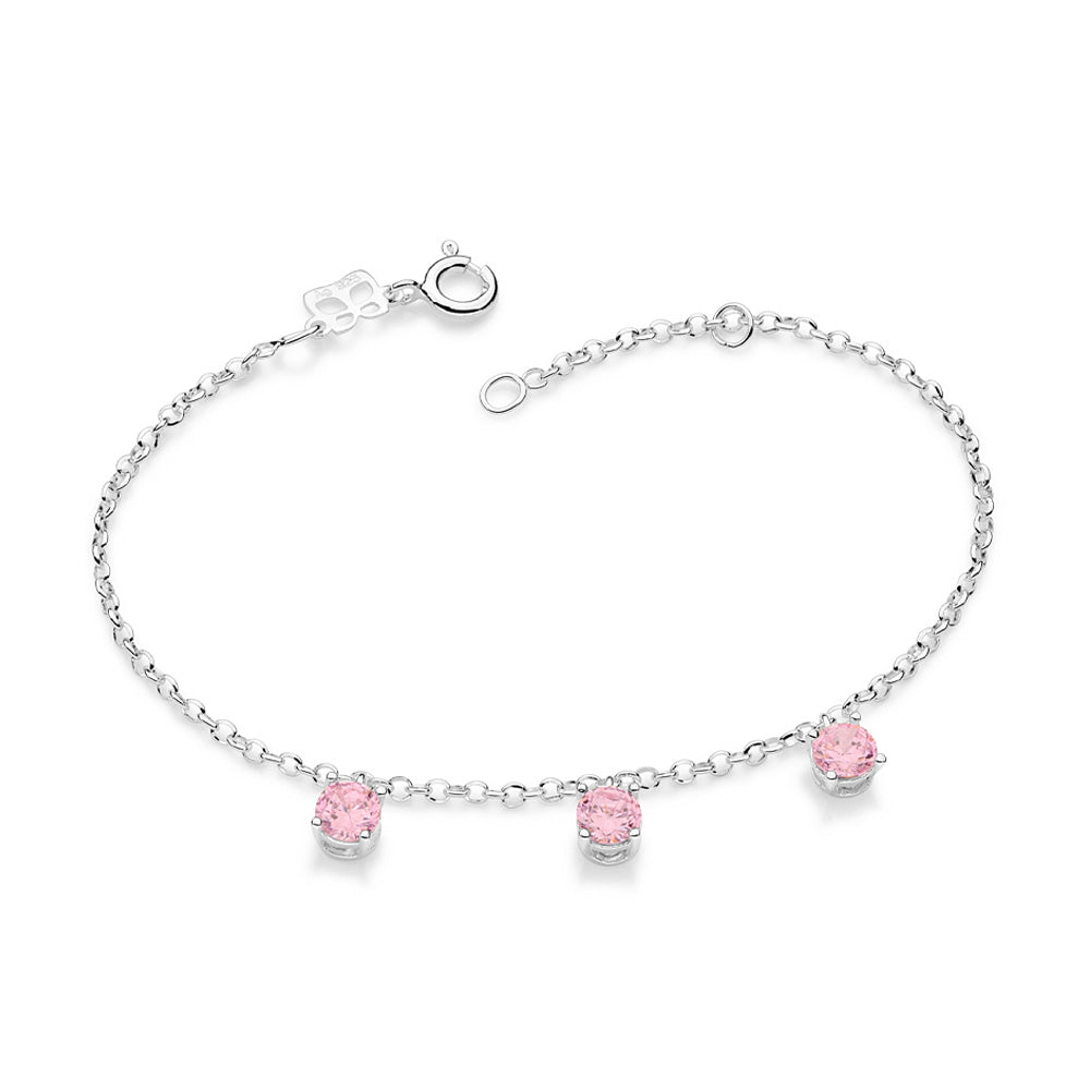 THIS CHARMING BRACELET MEASURING 7.48IN - ADJUSTABLE TO 6.69IN - CRAFTED IN SOLID 925 SILVER FEATURES A PORTUGUESE LINK CHAIN (0.40MM) ACCENTED WITH THREE DANGLING LIGHT PINK ZIRCONIAS (5MM). THE DELICATE MOVEMENT AND RADIANT SPARKLE MAKE IT A REFINED ADDITION TO ANY JEWELRY COLLECTION.