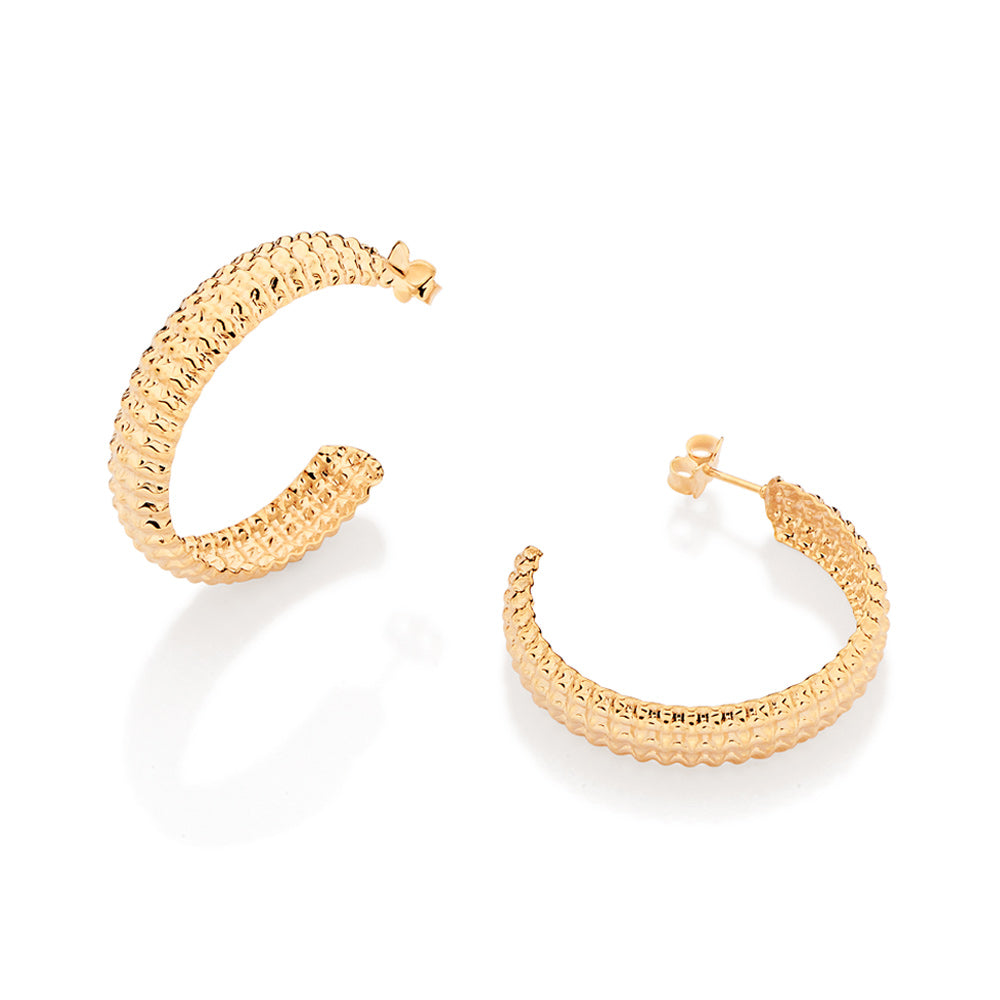18k gold-plated hoop earrings with a textured band. size: 3.4cm x 3.4cm (1.33in x 1.33in).