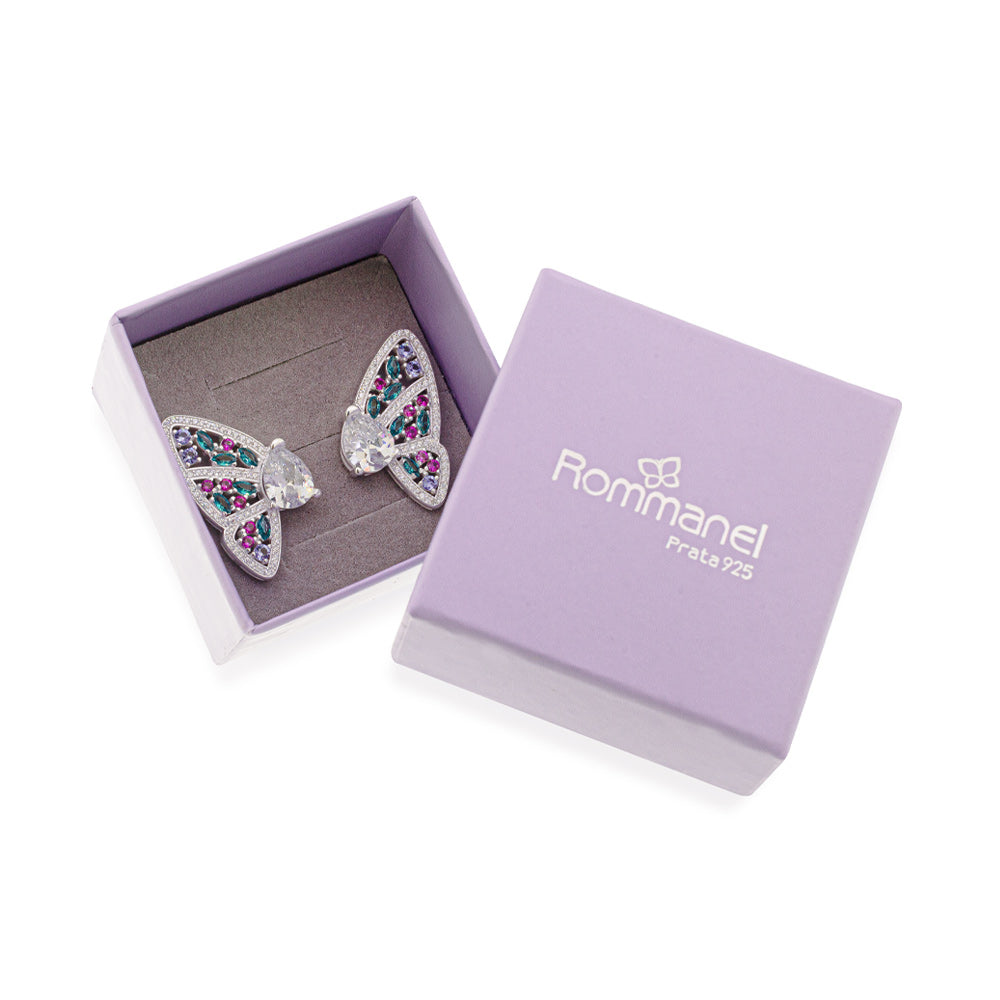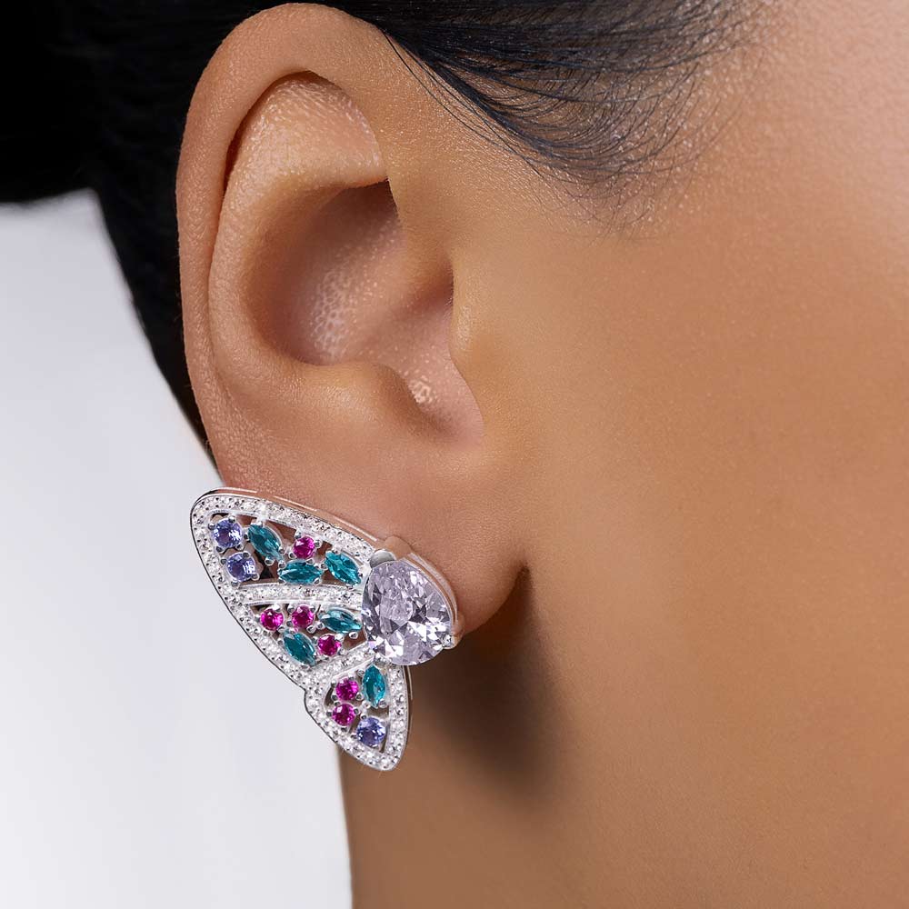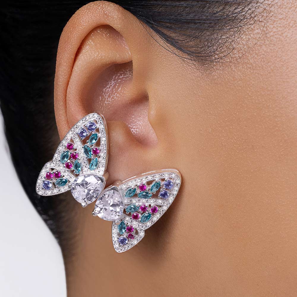This statement earring in solid 925 sterling silver showcases a butterfly motif adorned with one hundred and thirty (130) zirconias measuring 1mm each, twelve (12) zirconias measuring 2mm each, six (6) zirconias measuring 2.5mm each, twelve (12) navette zirconias measuring 2x4mm each, and two (2) pear-shaped zirconias measuring 8x10mm, measuring 2.9cm x 1.8cm (1.14in x 0.71in).