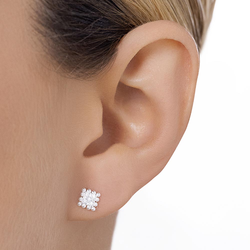 Elegant and modern, these solid 925 sterling silver square studs earrings measuring 0.6cm x 0.6cm (0.24in x 0.24in) feature a textured surface with delicate spheres and ten (10) shimmering white zirconias. A refined piece inspired by sunlit Mediterranean plazas.