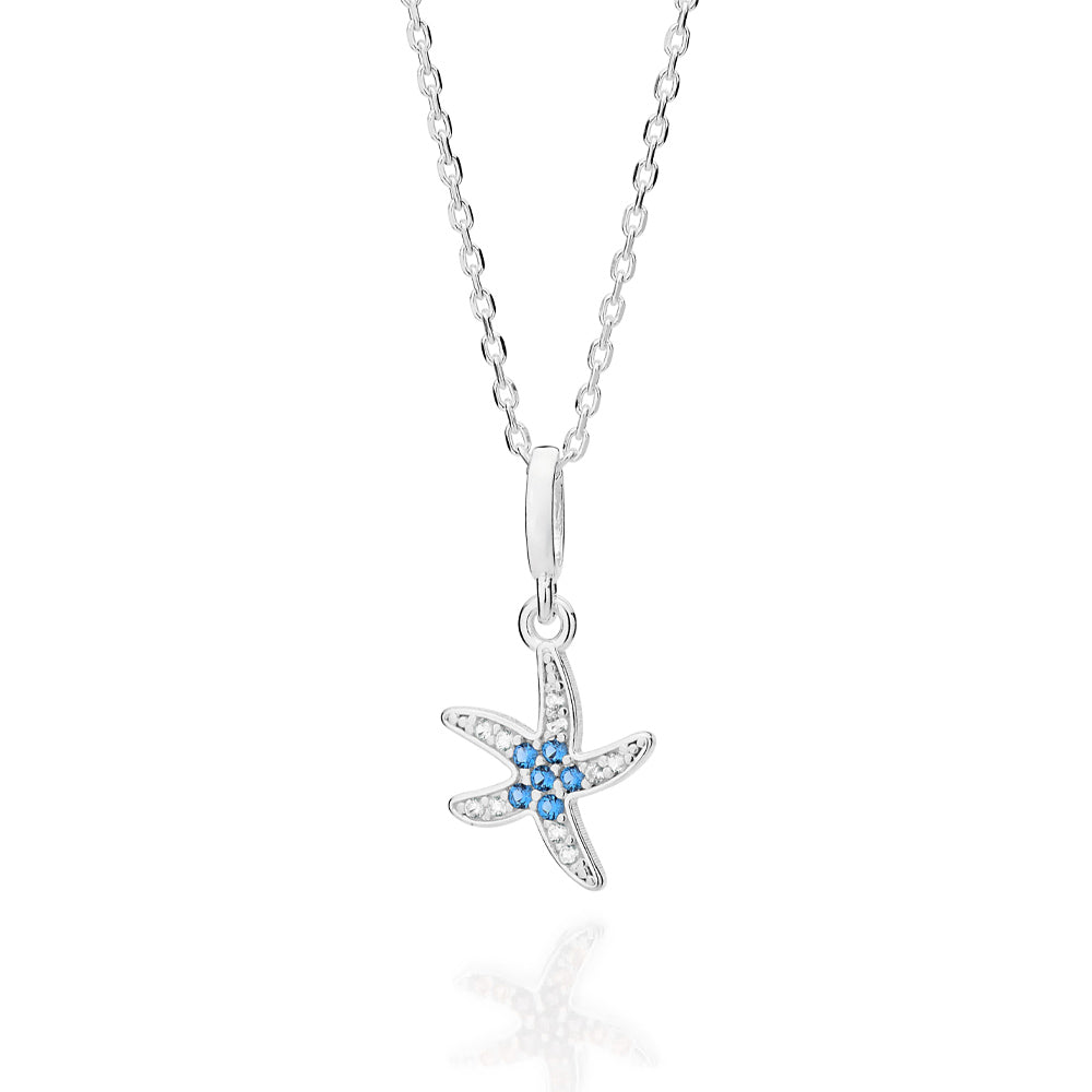 A radiant tribute to the sea, this solid 925 sterling silver starfish pendant measuring 2cm x 1.3cm (0.79in x 0.51in) sparkles with ten (10) white zirconias measuring 1.25mm and six (6) blue zirconias measuring 1.5mm each, inspired by sunlit Mediterranean shores.