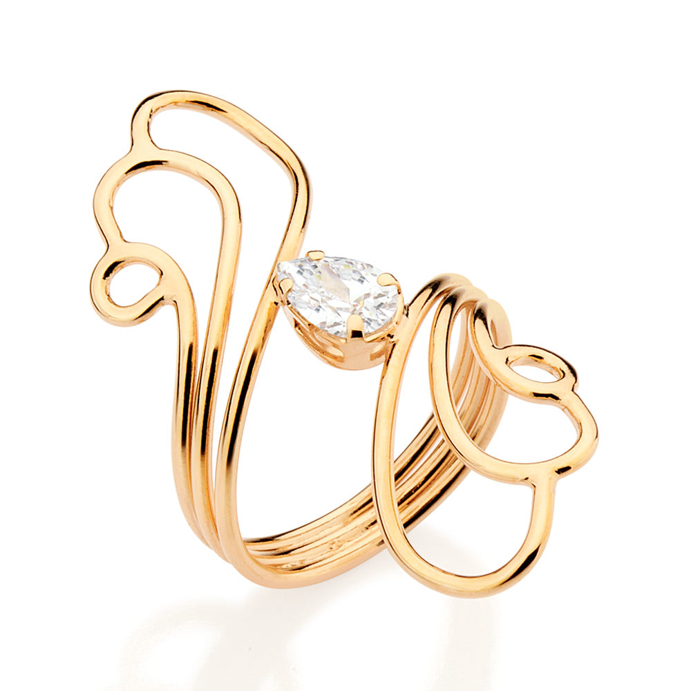 This bold 18K gold-plated maxi ring features a striking triple-band design with open droplet shapes, highlighted by one (1) delicate pear-cut white zirconia measuring 4mm × 6mm. A statement piece that blends modern elegance with sculptural flair - perfect for elevating both casual and dressy looks.