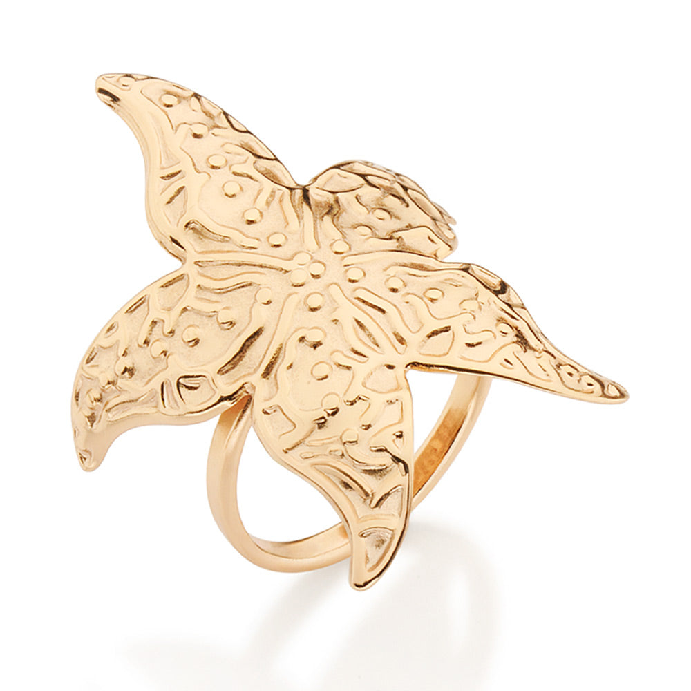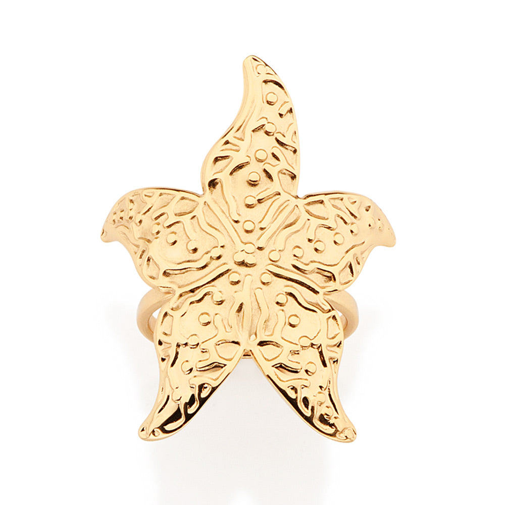 Inspired by the sea, this 18K gold-plated maxi ring showcases a starfish design with high-relief detailing that adds texture and dimension. A standout piece that brings coastal charm and bold sophistication to your jewelry collection.