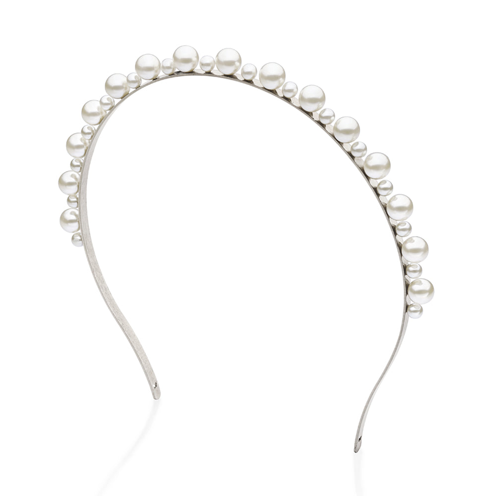 Platinum hair band studded by 16 synthetic pearls measuring 6mm each intercalating with 15 synthetic pearls measuring 10mm each. size: 13cm (5.12in).