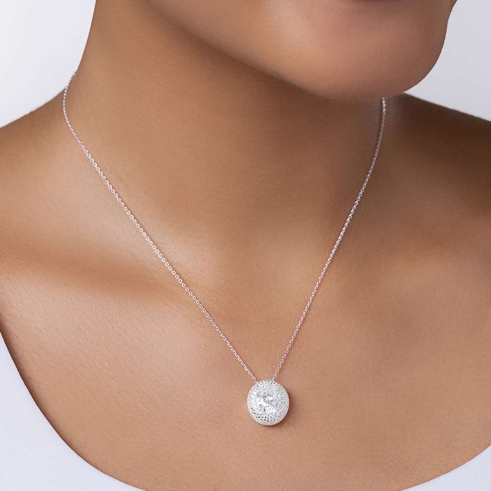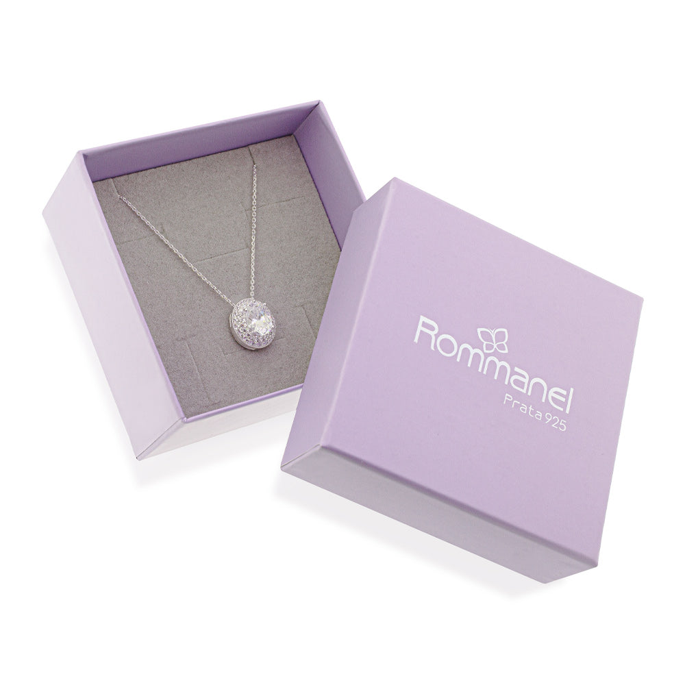 CRAFTED IN SOLID 925 STERLING SILVER, THIS CHAIN NECKLACE MEASURING 45CM (18IN), ADJUSTABLE TO 42CM (16IN), FEATURES AN OVAL PENDANT ADORNED WITH FORTY (40) WHITE ZIRCONIAS MEASURING 1.5MM EACH AND ONE (1) OVAL WHITE ZIRCONIA MEASURING 8X10MM.