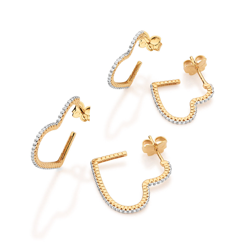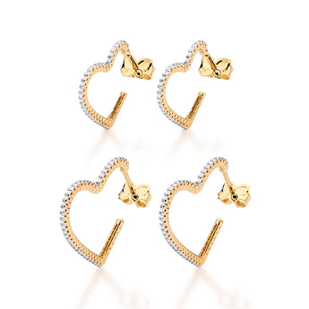 Double the sparkle, double the charm. this 18k gold-plated earring kit features two pairs of heart-shaped hoops one petite and one bold both encrusted with shimmering white zirconias. the smaller hoops shine with 56 stones measuring 1.2cm x 1.5cm (approximately 0.47 x 0.59), while the larger pair dazzles with 74 measuring 2.1cm x 2cm (approximately 0.83 x 0.79). romantic, radiant, and made to shine from every angle.