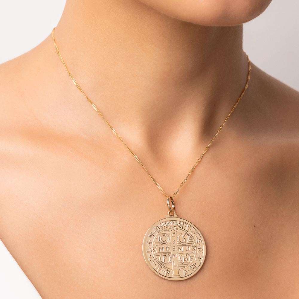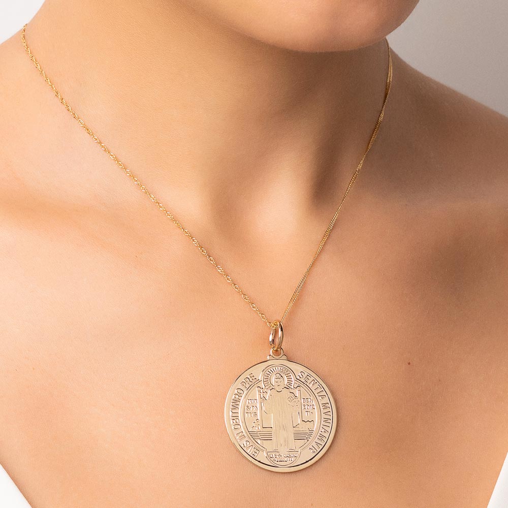 18k gold plated circle medal pendant with the image of saint benedict at the center. size: 4.8cm x 3cm (1.89in x 1.18in).