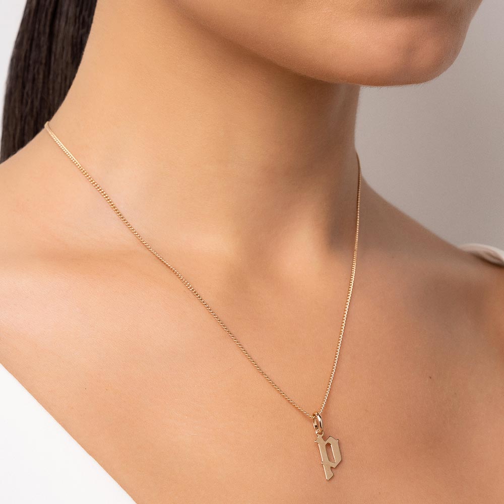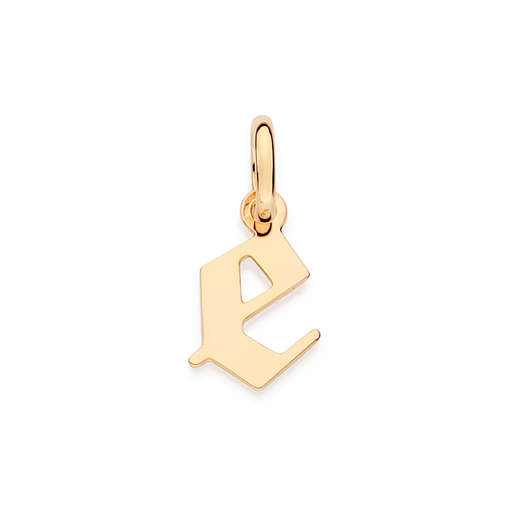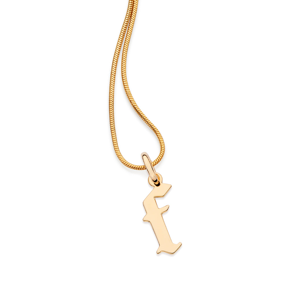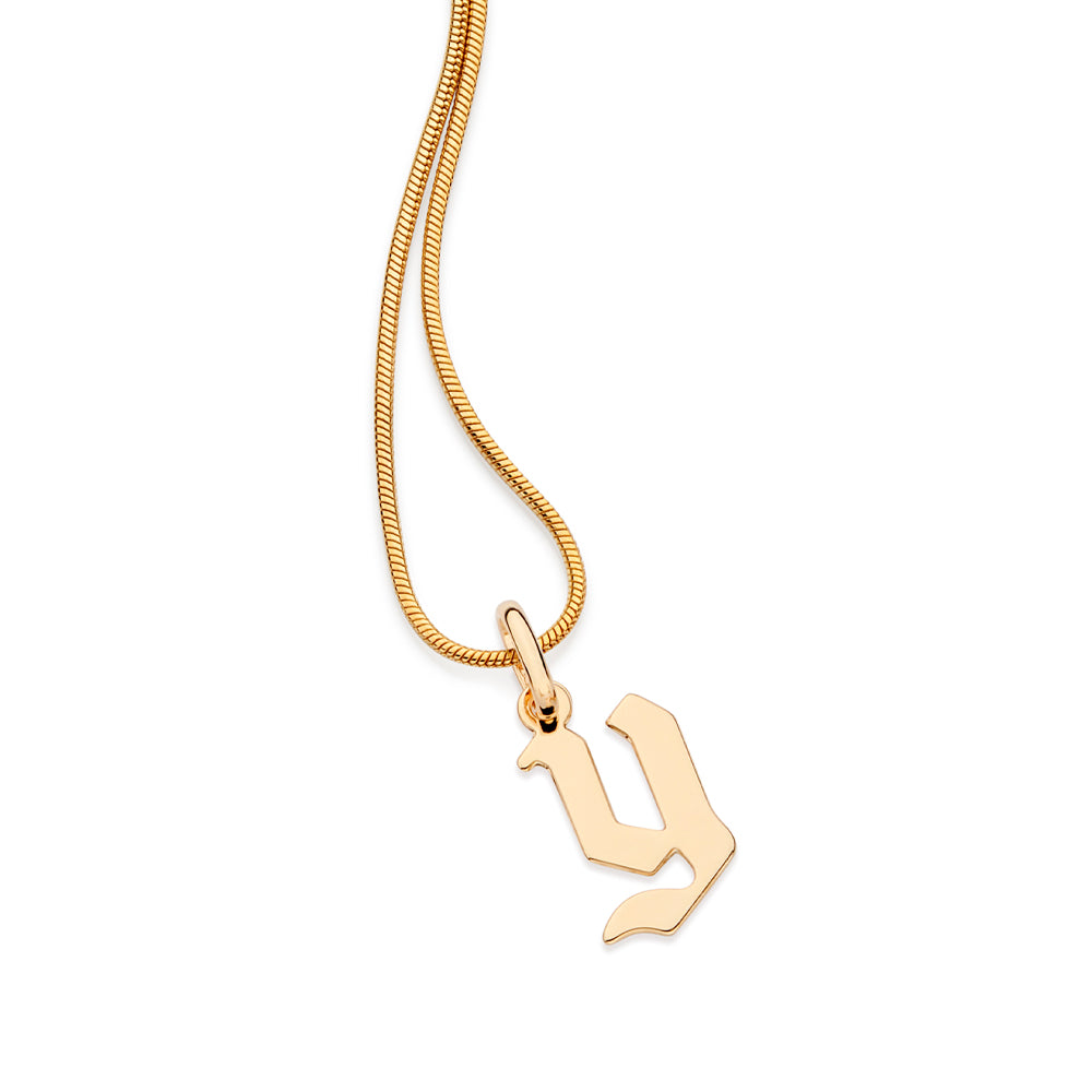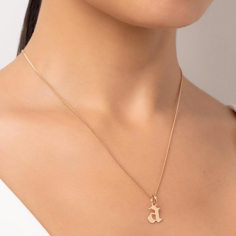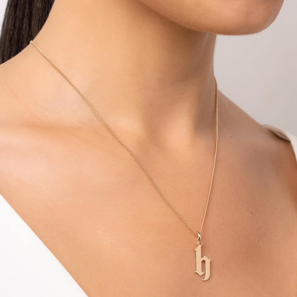 18k gold plated letter pendant in script style. size: 1.9cm x 1.6cm (0.75in x 0.63in).