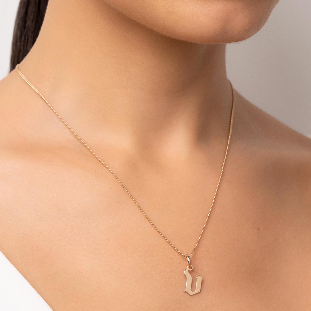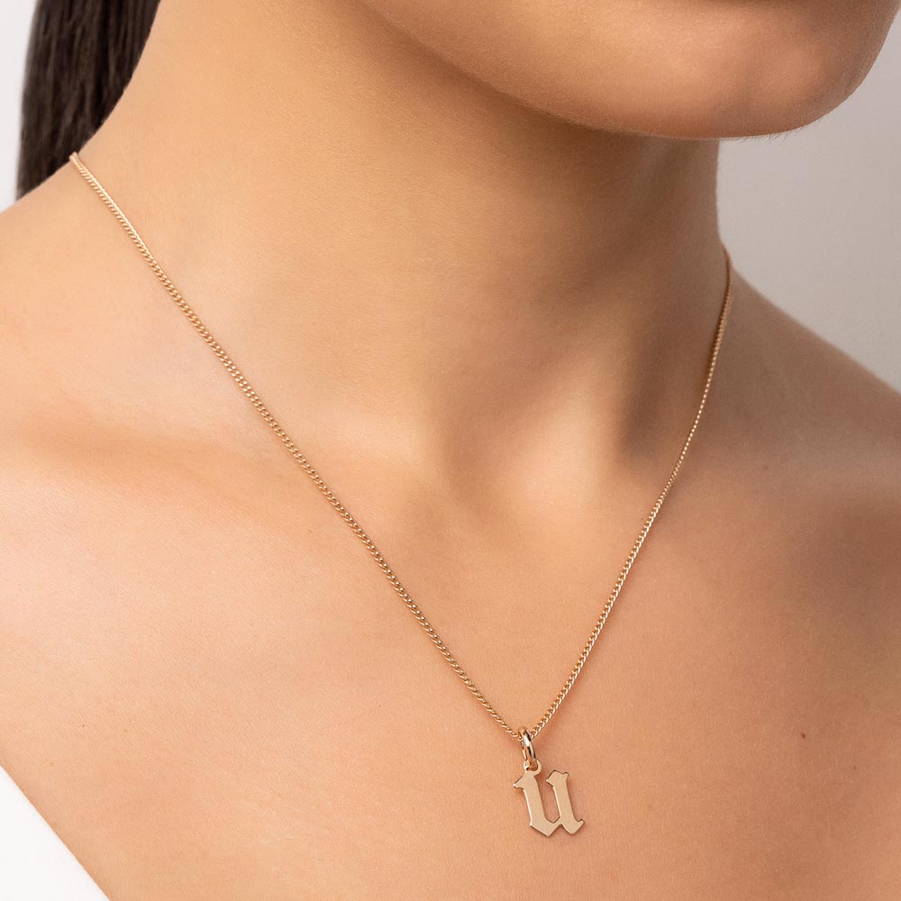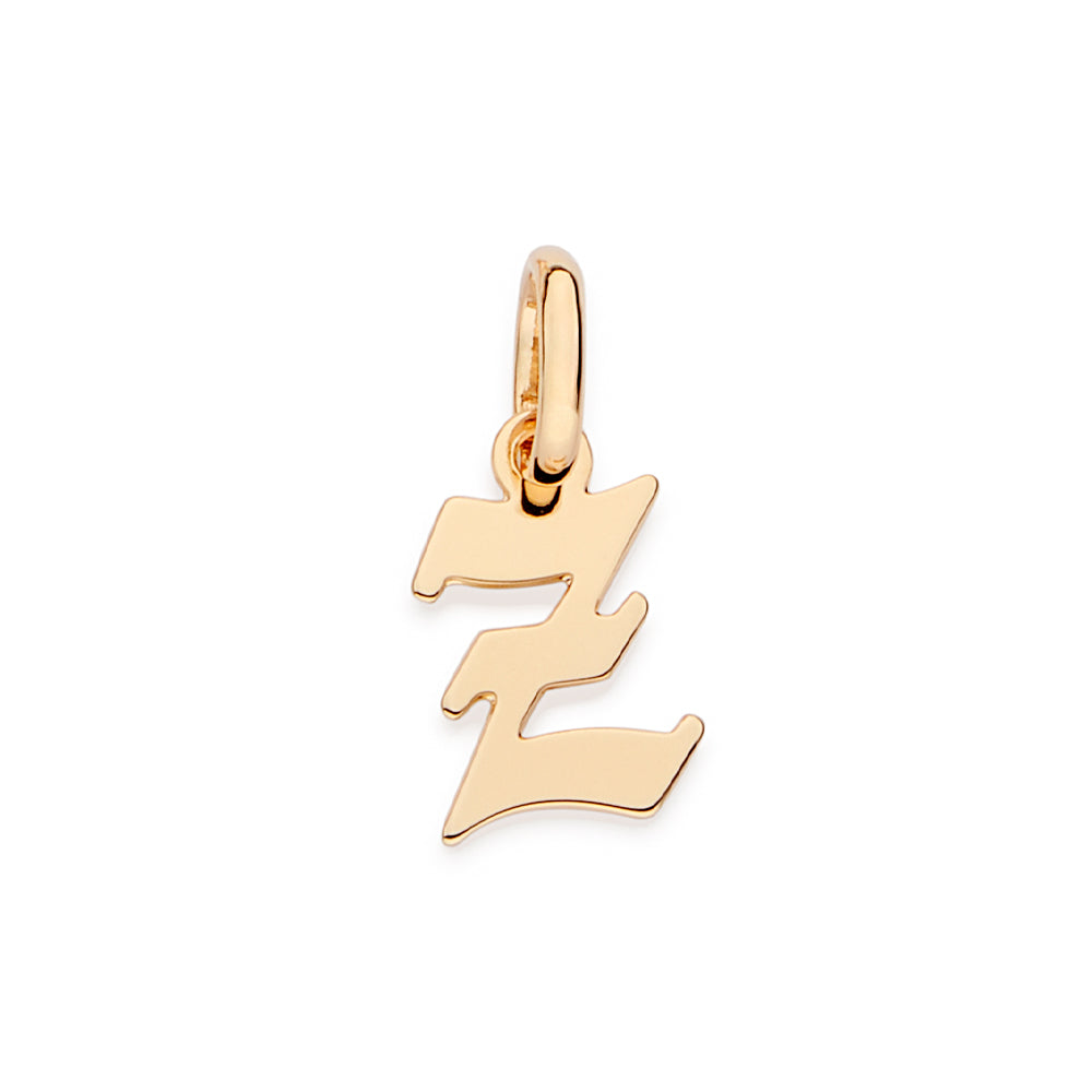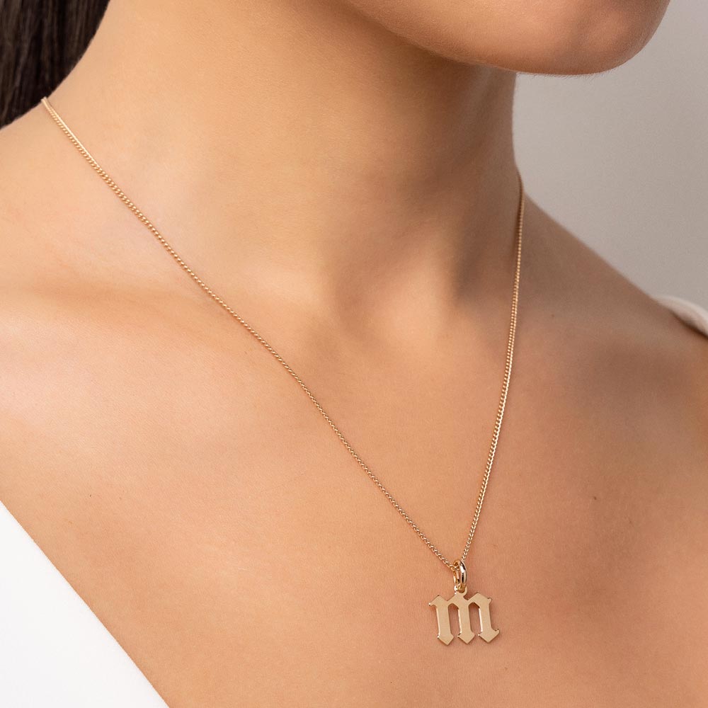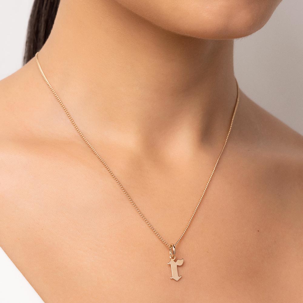 18k gold plated letter pendant in script style. size: 1.9cm x 1.6cm (0.75in x 0.63in).
