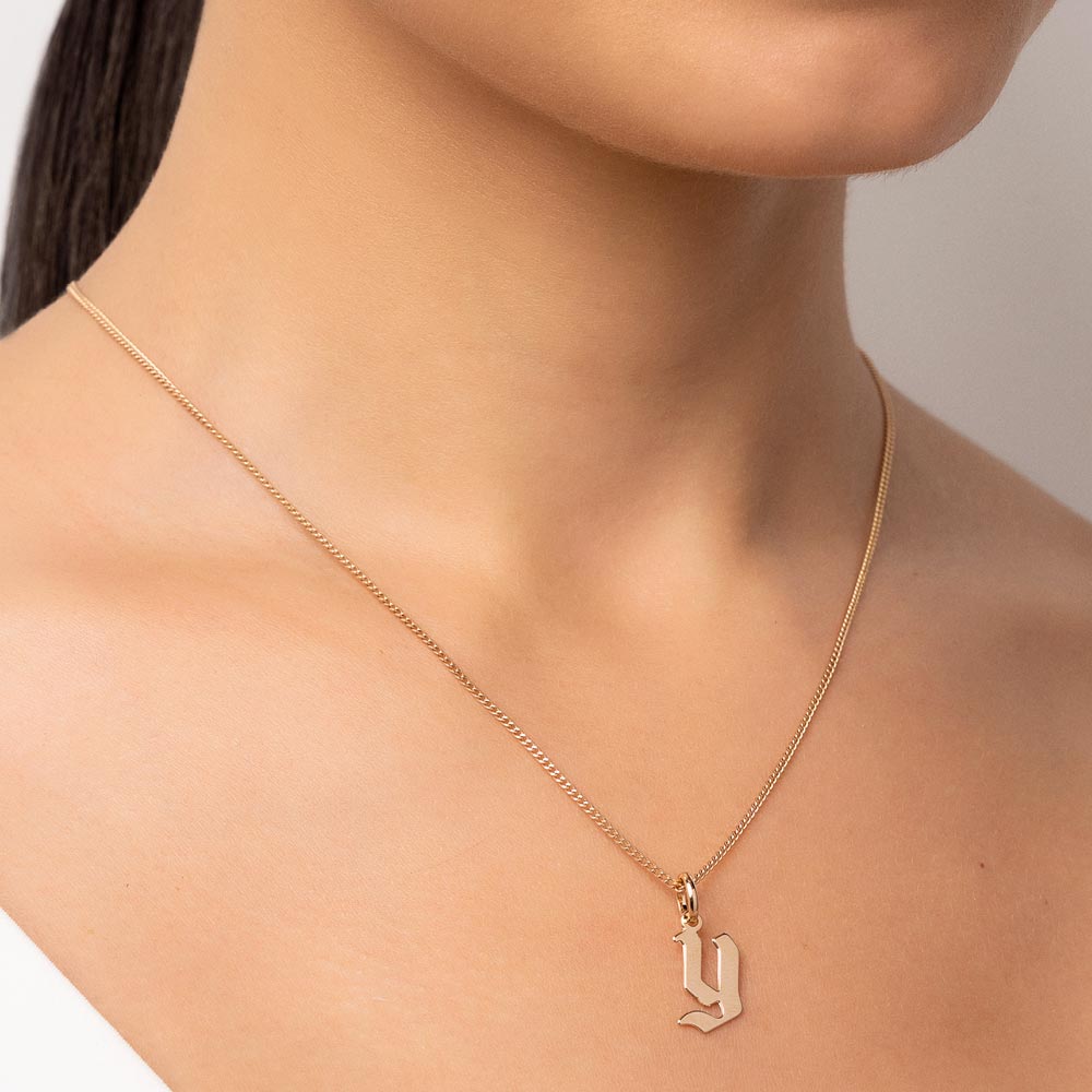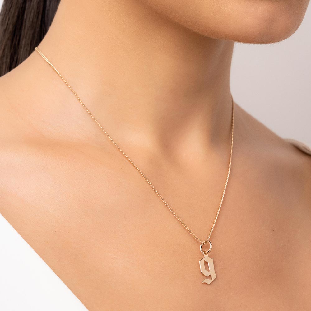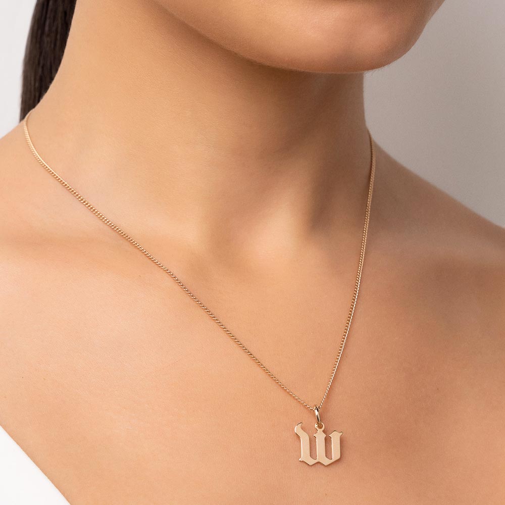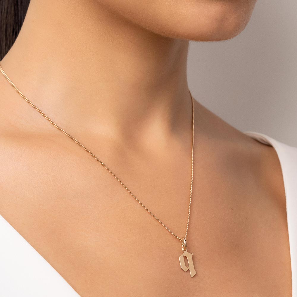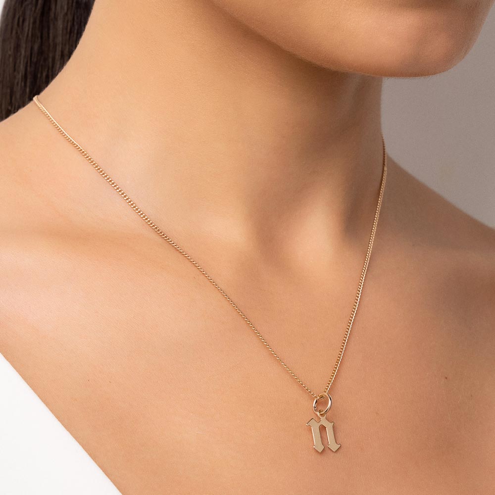 18k gold plated letter pendant in script style. size: 1.9cm x 1.6cm (0.75in x 0.63in).