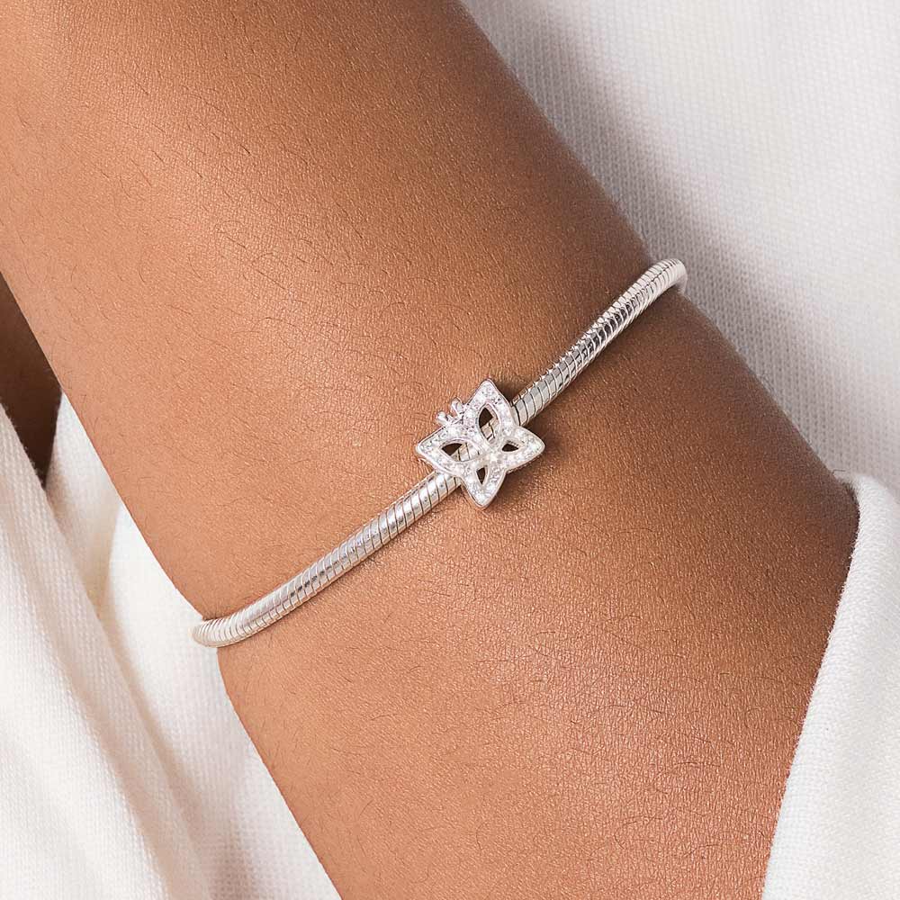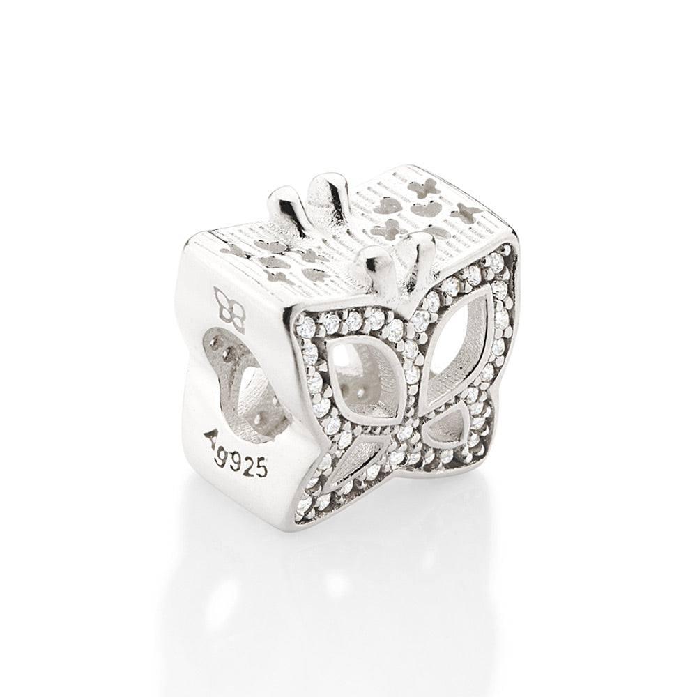 Delicately crafted in high-quality silver , this exquisite charm captures the essence of Rommanel with a graceful butterfly design inspired by the brand's iconic logo. its wings are adorned with dazzling white zirconias, each measuring , offering a radiant sparkle from every angle. measuring (approximately ), this charm adds a touch of elegance and sophistication to any bracelet or necklace. perfect for those who appreciate fine details and timeless beauty.