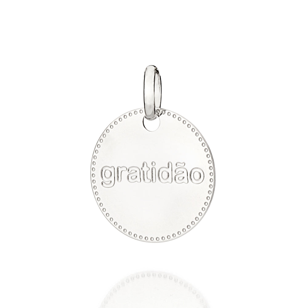 Platinum circle pendant with a textured outline and the word gratidãƒo (gratitude) engraved at the center. size: 1.8cm x 1.4cm (0.7in x 0.6in).