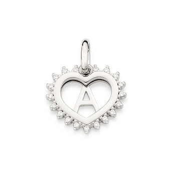 Platinum pendant in the shape of a heart studded with nineteen (19) white zirconias measuring 1mm each with a letter at the center of the heart.