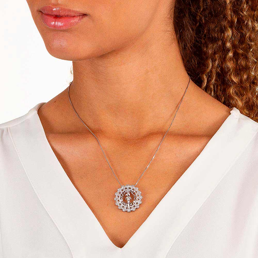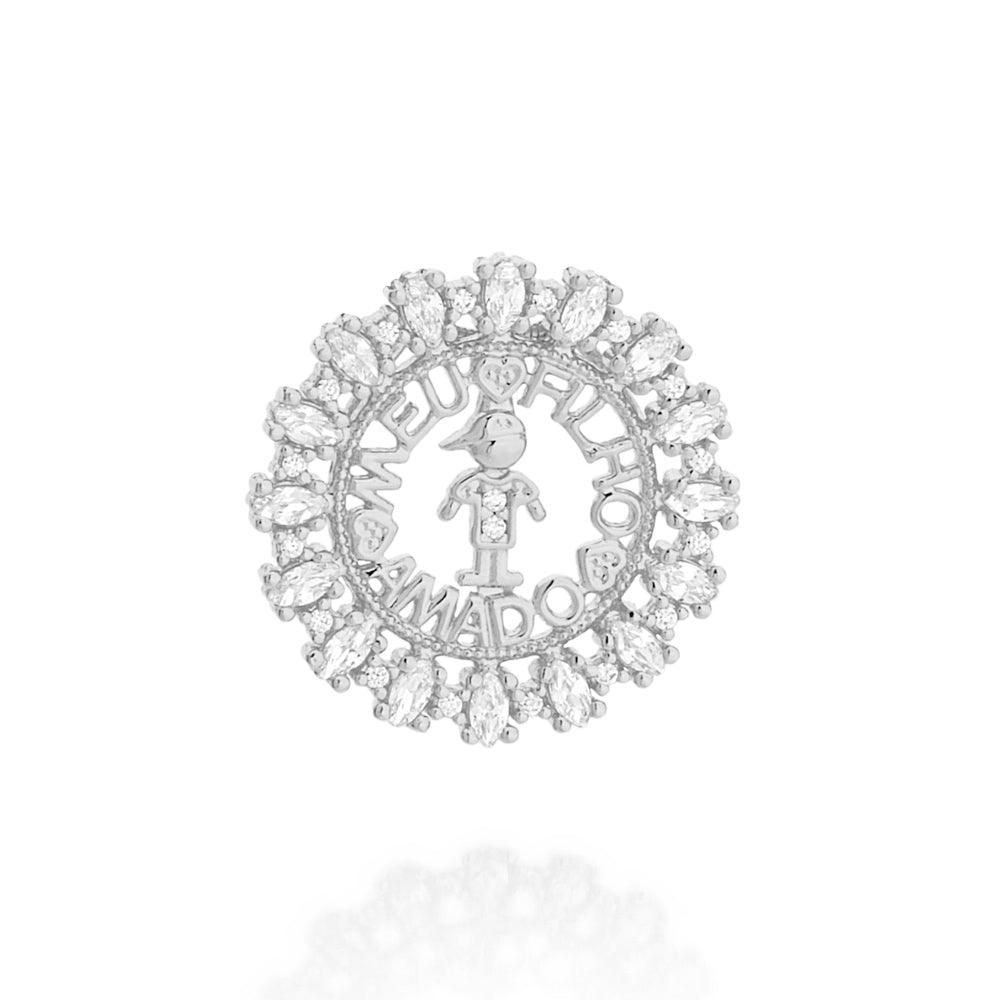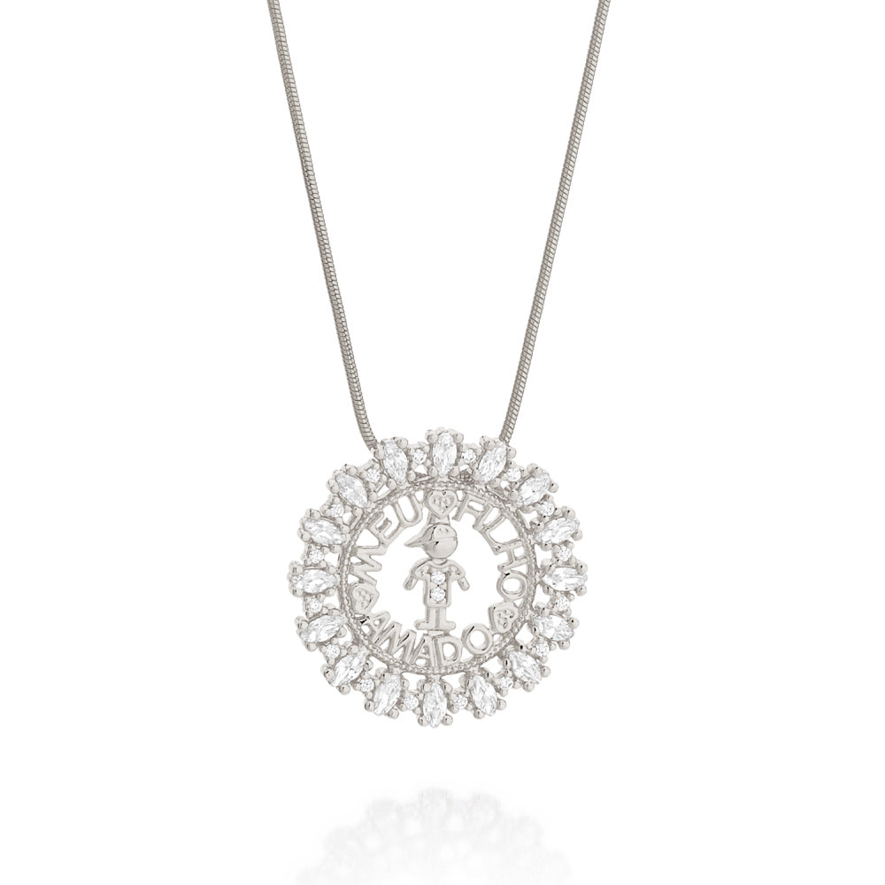 Rommanels permanent collection brings you traditional jewelry designs that are independent of current fashion trends and always in style. our Mothers day day capsule brings delicate and timeless pendants that represent the most pure and truthful emotion – the love between a mother and her child. rhodium rounded pendant studded with sixteen (16) white navette zirconias measuring 2x4mm each and sixteen (16) white zirconias measuring 1.25mm each featuring a boy outline at the center with two (2) white zirconias measuring 1.25mm each and the words “meu filho amado” (my beloved son). | material: rhodium plated. | also available in gold plated or in a girl version.