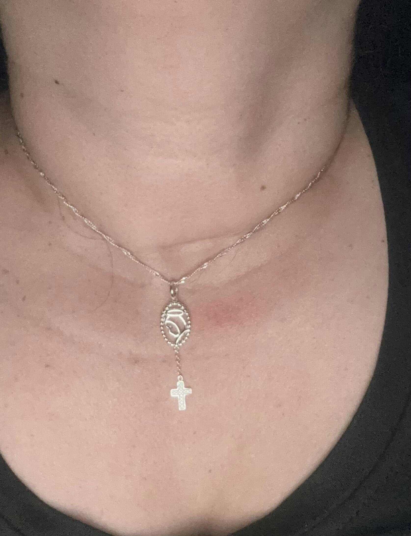 Silver 925 pendant composed of an oval base with our lady of fatima at the center studded by eleven (11) white zirconias measuring 1mm each and a cross hanging from it. size: 4.3cm x 1.1cm (1.69in x 0.43in).