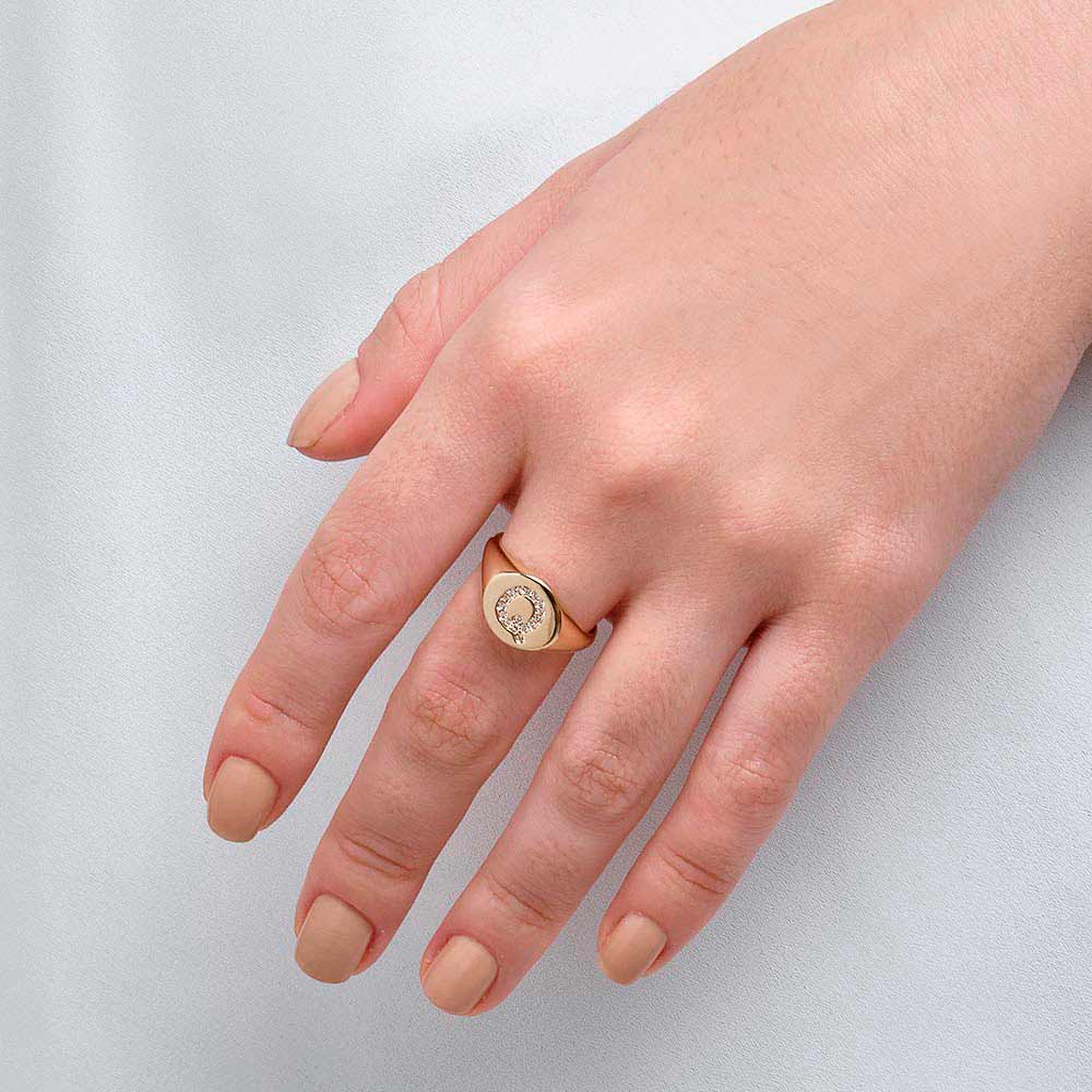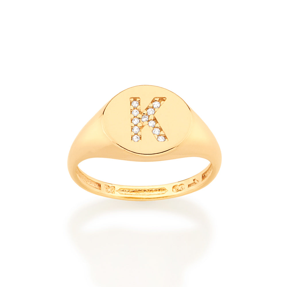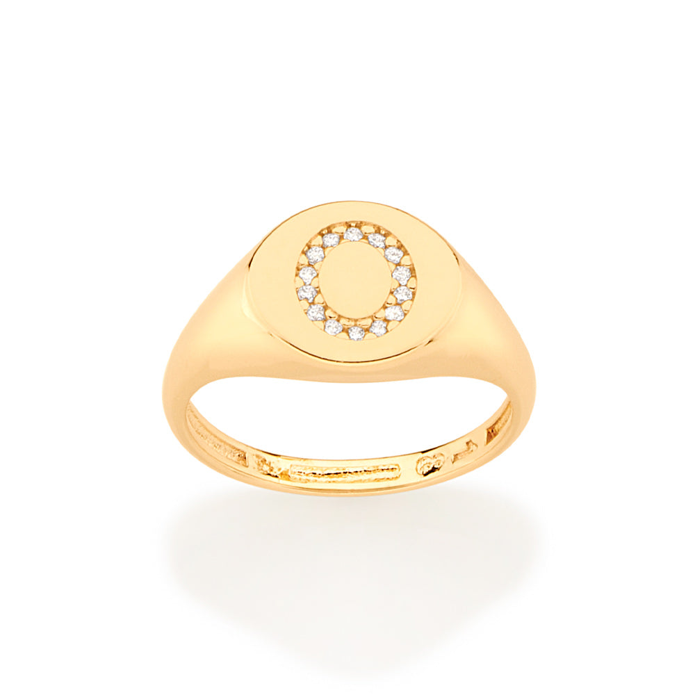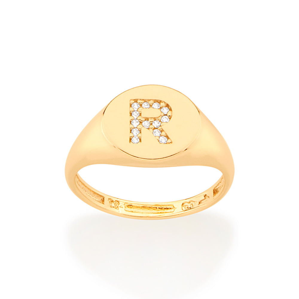 Rommanel presents the power to transform, an annual collection that reinforces your purpose and celebrates Rommanels 35th birthday. with jewelry that tells a story and translates Rommanels essence, the collection brings you pieces full of meaning. gold plated pinky ring composed of a studded letter with white zirconias measuring 1mm each (the number of zirconias will depend on the letter). | stone: zirconia. | material: 18k gold plated. "