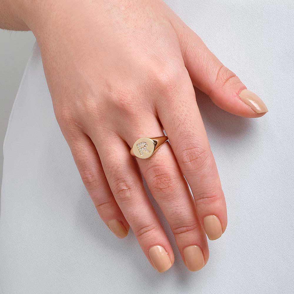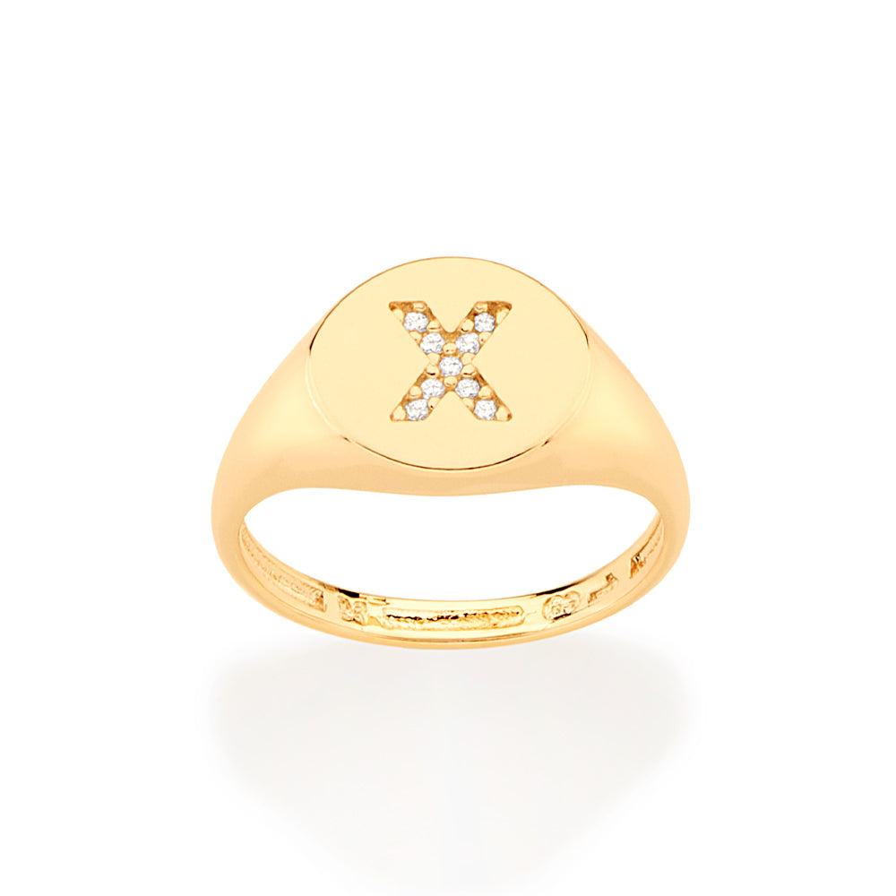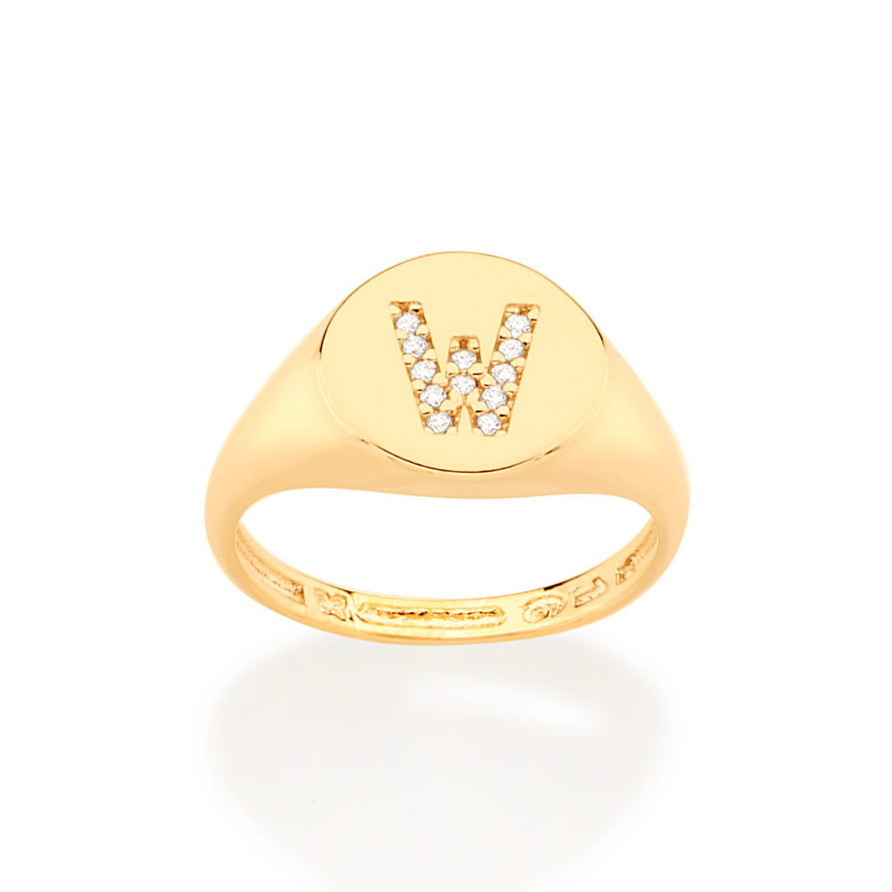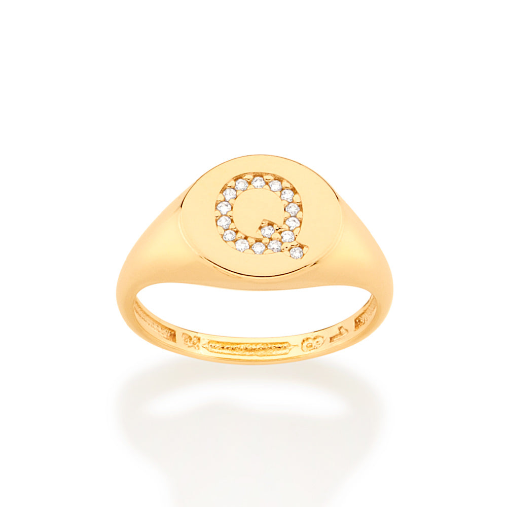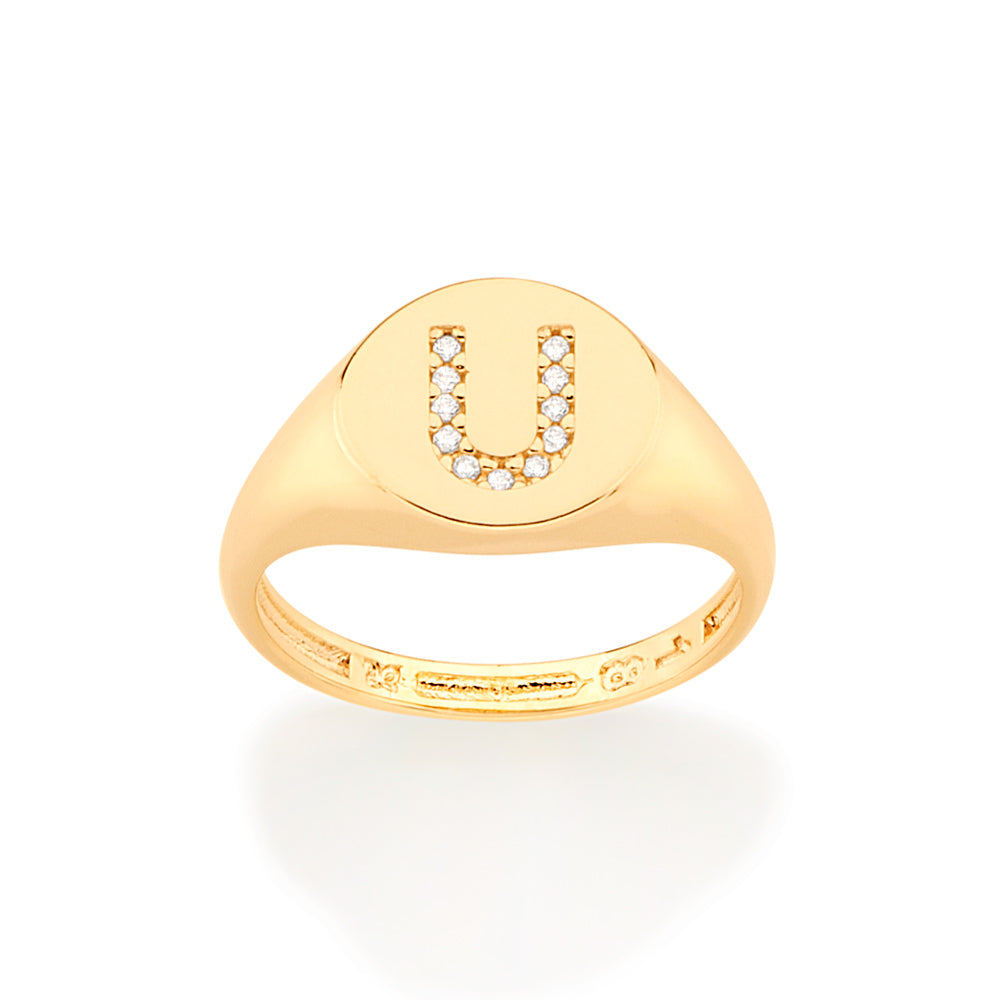 Rommanel presents the power to transform, an annual collection that reinforces your purpose and celebrates Rommanels 35th birthday. with jewelry that tells a story and translates Rommanels essence, the collection brings you pieces full of meaning. gold plated pinky ring composed of a studded letter with white zirconias measuring 1mm each (the number of zirconias will depend on the letter). | stone: zirconia. | material: 18k gold plated. "