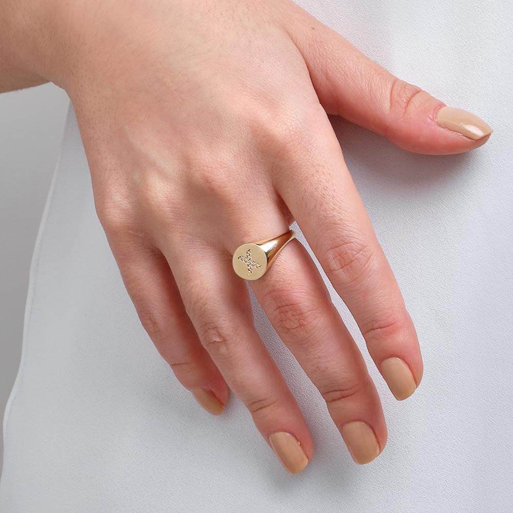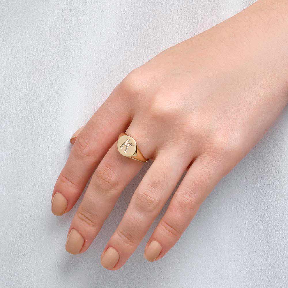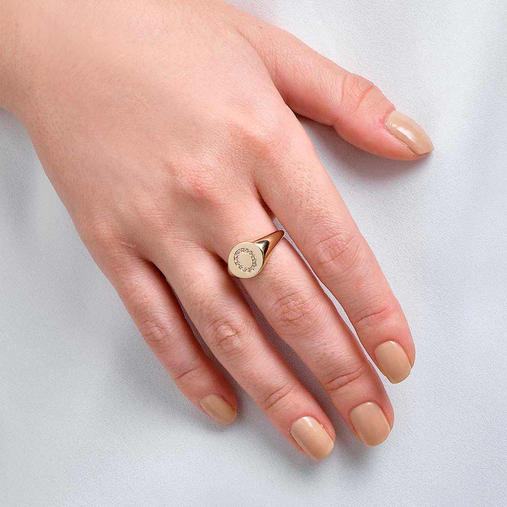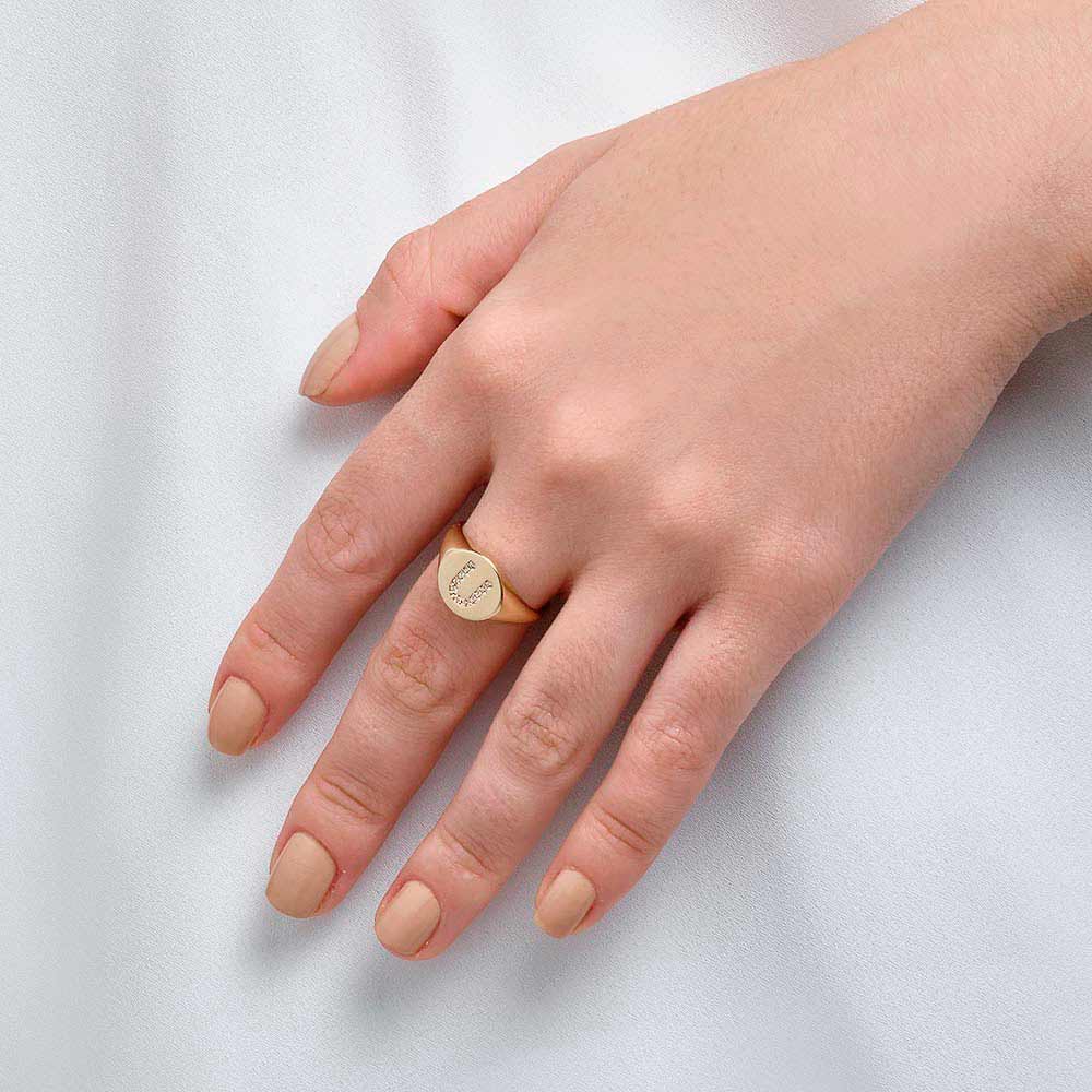 Rommanel presents the power to transform, an annual collection that reinforces your purpose and celebrates Rommanels 35th birthday. with jewelry that tells a story and translates Rommanels essence, the collection brings you pieces full of meaning. gold plated pinky ring composed of a studded letter with white zirconias measuring 1mm each (the number of zirconias will depend on the letter). | stone: zirconia. | material: 18k gold plated. "