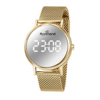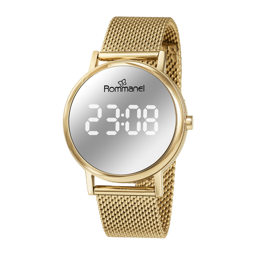 Sleek and futuristic, this gold digital led watch features a mirrored dial with bright white numbers. Its round metal case, mineral glass, and gold mesh strap measuring 23cm (9.05in) create a bold yet elegant aesthetic. The adjustable slide clasp ensures a perfect fit, and the watch is water-resistant up to 50m (165ft).