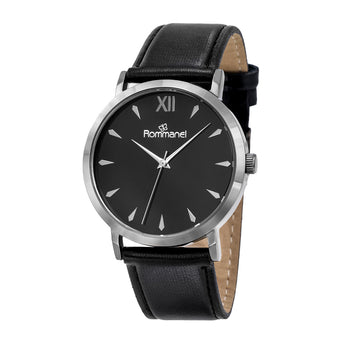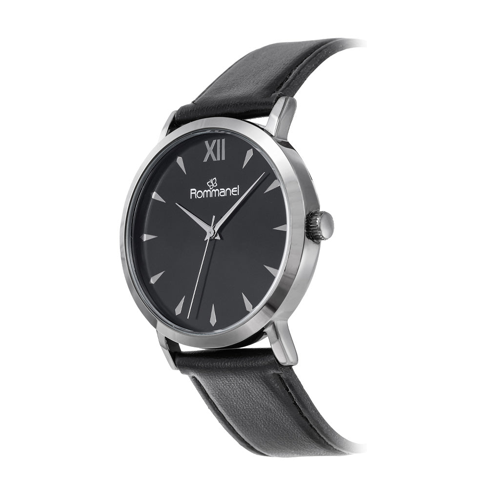 Modern and refined, this graphite-finish analog watch showcases a round metal case with a black dial, Roman numerals, and gray hands under mineral glass. Finished with a black synthetic-leather strap and a buckle closure. Water resistant up to 50 meters (164ft). Measurements: total length 23cm (9.05in).