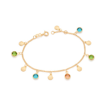 The chain is beautifully accented by a lively mix of five colorful crystals and charming dangling seashell charms. This piece combines sparkling color with a carefree coastal theme, making it a perfect summer accessory or a year-round reminder of the shore.
