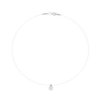 The stone is expertly secured on a fine Nylon cord, giving the illusion that the diamond-like sparkle is suspended magically around your neck. This necklace is perfect for layering or adding a subtle touch of brilliance to any look.