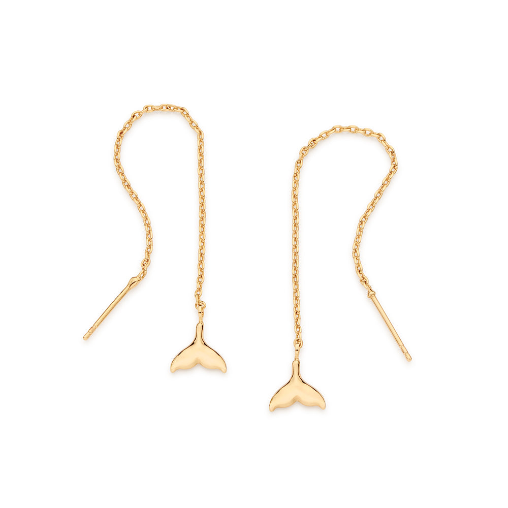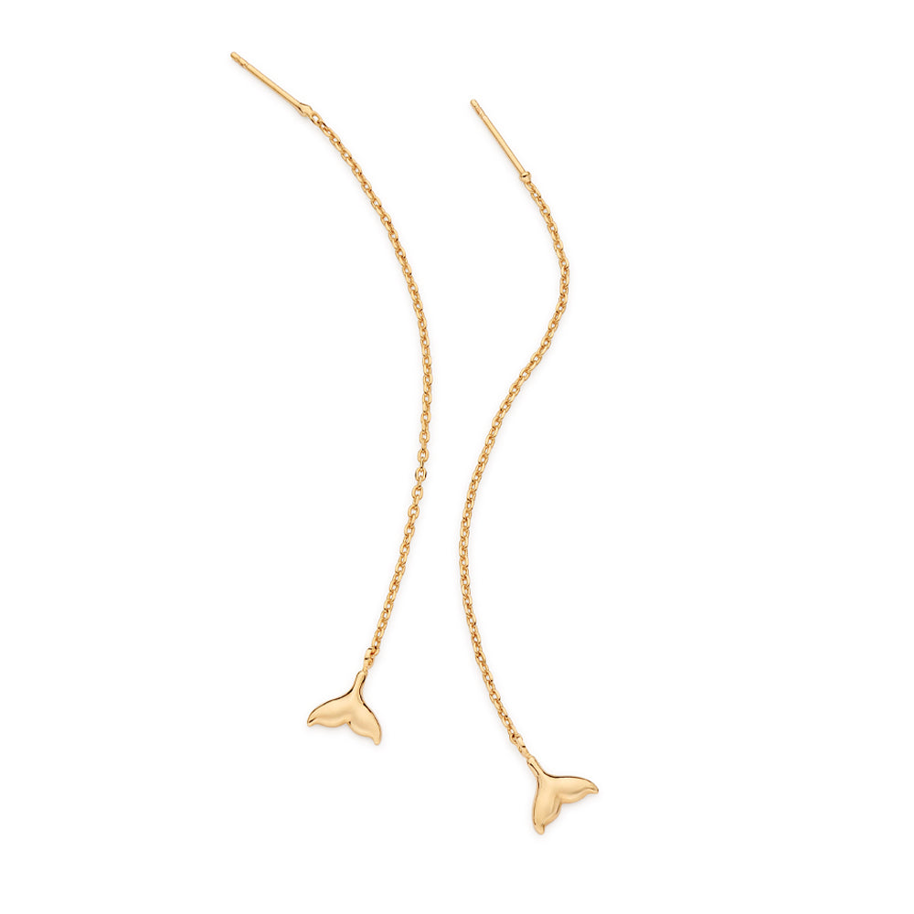 Bold and expressive, these 18K gold-plated earrings measuring 9.4cm x 0.8cm (3.7in x 0.31in) feature diamond-cut link chains finished with two (2) whale tail charms, delivering dramatic length and ocean-inspired style.