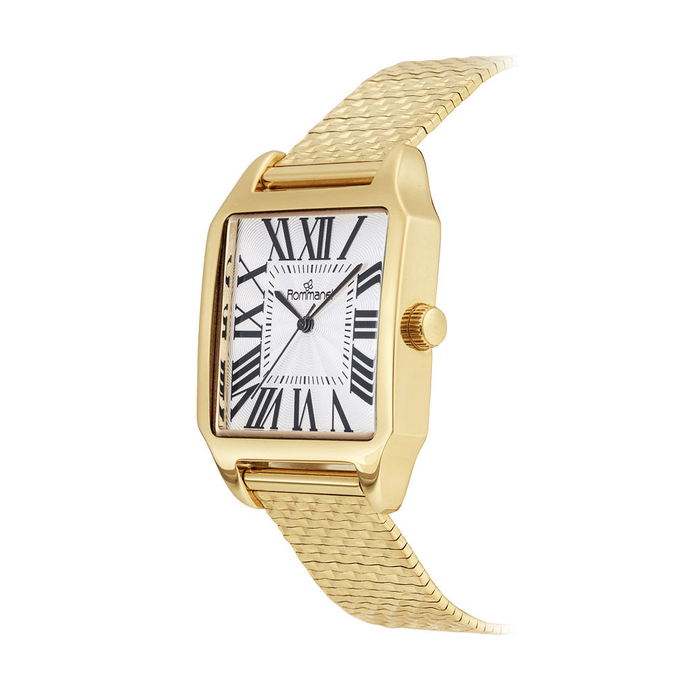 A refined statement piece that blends classic charm with a contemporary edge. This square gold analog watch features a white dial with bold roman numerals and black hands for a striking contrast. The mineral glass and stainless-steel bracelet measuring 23cm (9.05in) include a slide-and-lock clasp for a secure, customizable fit. Water-resistant up to 30m (98ft).