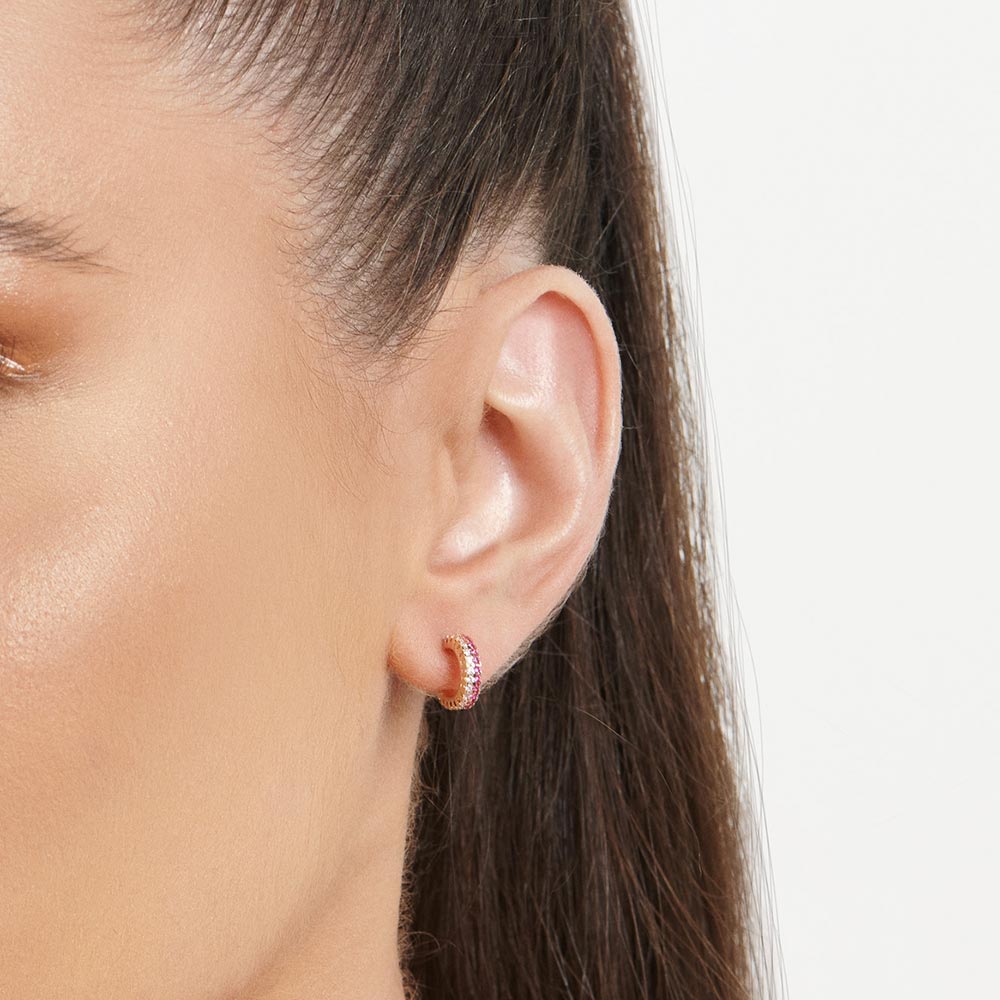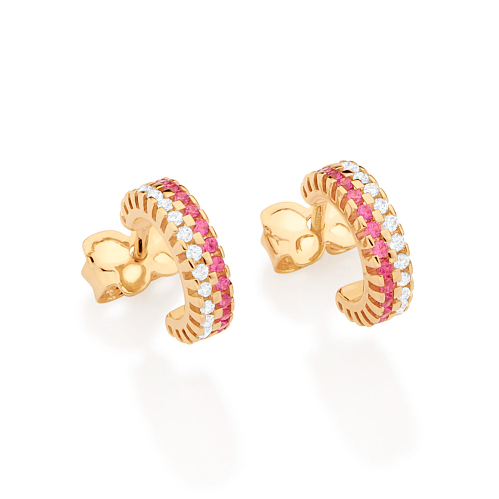 Gold plated huggie earrings studded with 34 zirconias measuring 1mm each in pink and white. size: 1cm in diameter (0.4in in diameter).