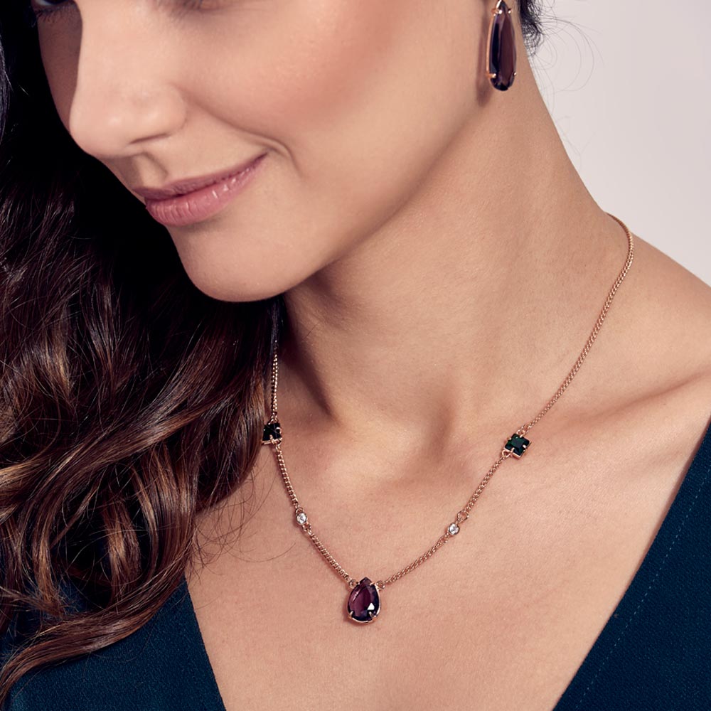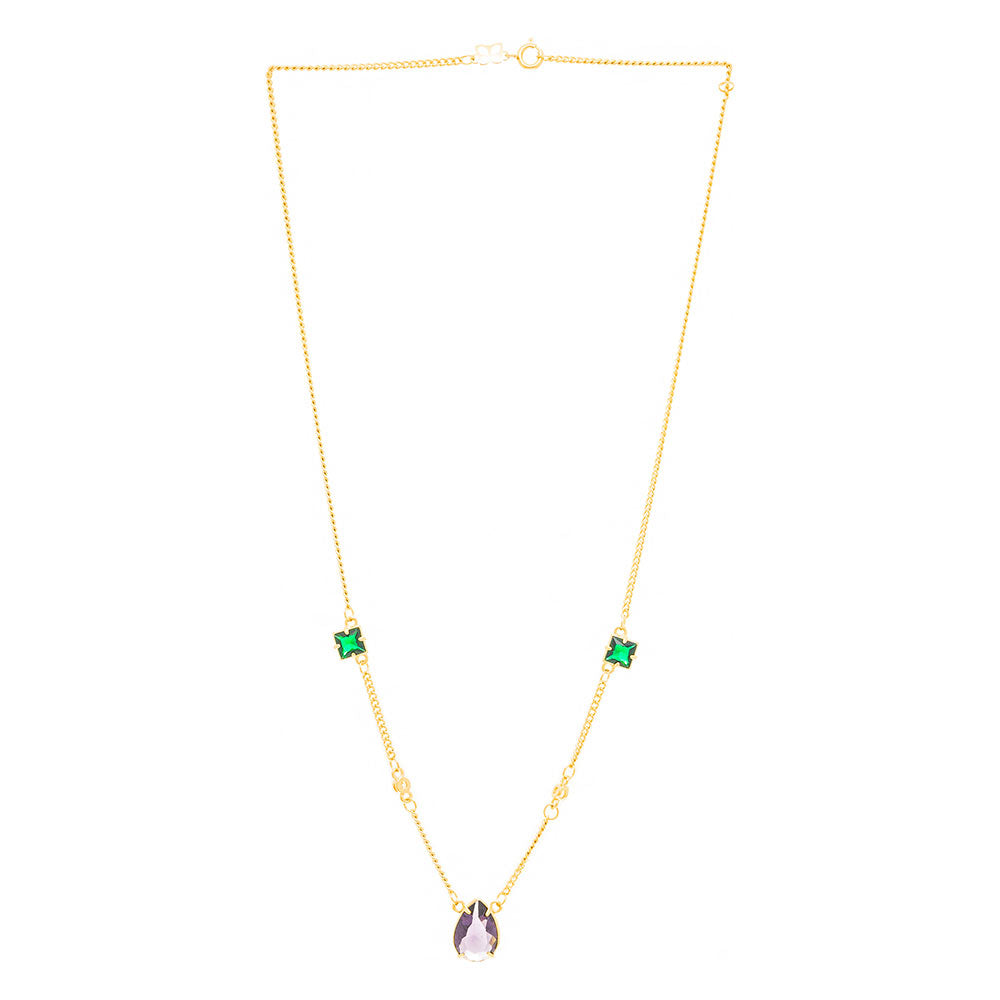 The miss violet collection was inspired by the color of the year and by violets a lovely, and delicate flower. Rommanel has brought the essence of these flowers to the collection and created jewelry that is full of meaning. let yourself be carried away by the delicacy of these flowers too. gold plated necklace composed of a 0.5mm curb chain measuring 50cm - can be adjusted to 45cm - featuring two (2) green crystals measuring 6x6mm each, two (2) white zirconieas measuring 3mm each, and one (1) purple crystal in the shape of a water drop measuring 10x14mm. an absolute must have in your collection! | size: 50cm - can be adjusted to 45cm. | material: 18k gold plated. "