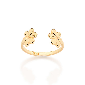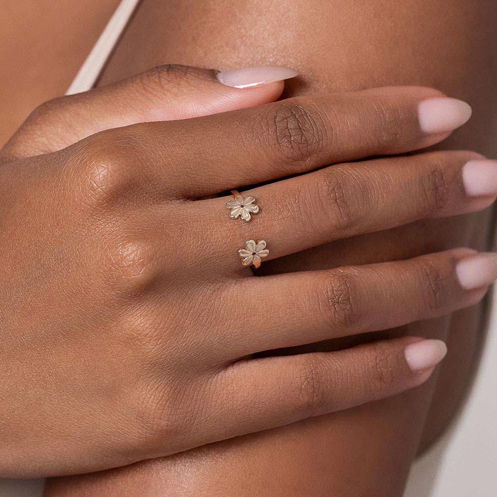 Adjustable ring featuring two openwork flowers with delicate, low-relief detailing.