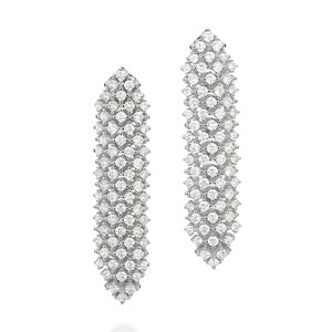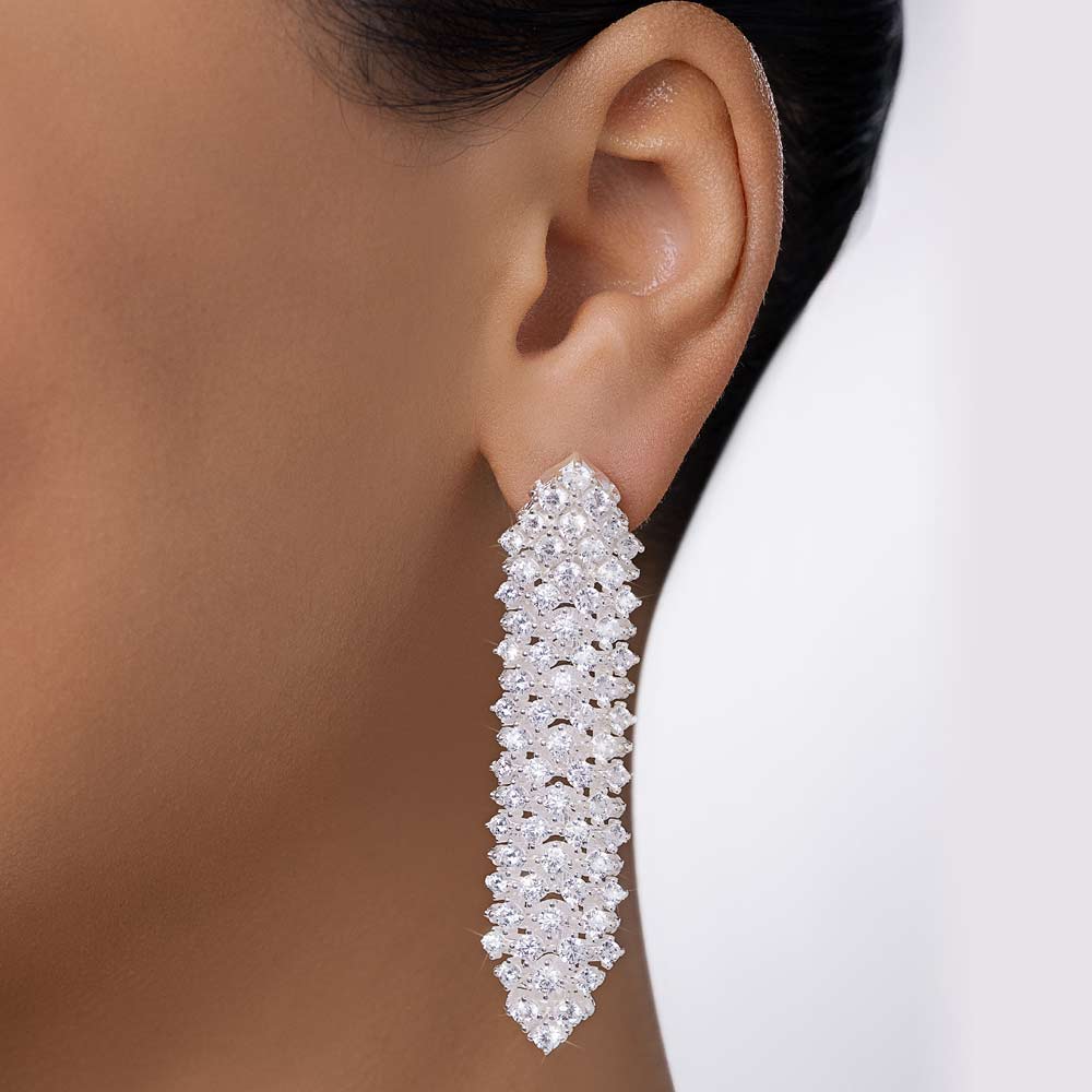 These bold statement earrings are crafted in solid 925 sterling silver and fully adorned with shimmering zirconia stones for maximum impact. Featuring ninety (90) white zirconias measuring 3mm each and forty (40) white zirconias measuring 2.5mm each, the design delivers intense brilliance and a glamorous presence. Measuring approximately 6.1cm x 1.5cm (2.4in x 0.59in), these maxi earrings are designed for special occasions or elevated styling moments where elegance meets bold expression.